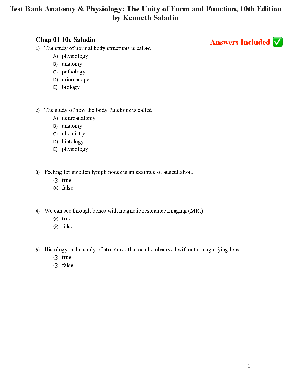 Anatomy and Physiology - A&P 1 > TEST BANKS > Test Bank Anatomy & Physiology: The Unity of Form and Function, 10th Edition by Kenneth Saladin (All)