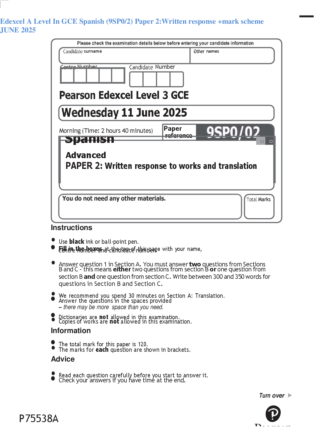 Spanish > Edexcel > Edexcel A Level In GCE Spanish (9SP0/2) Paper 2:Written response +mark scheme JUNE 2025 (All)