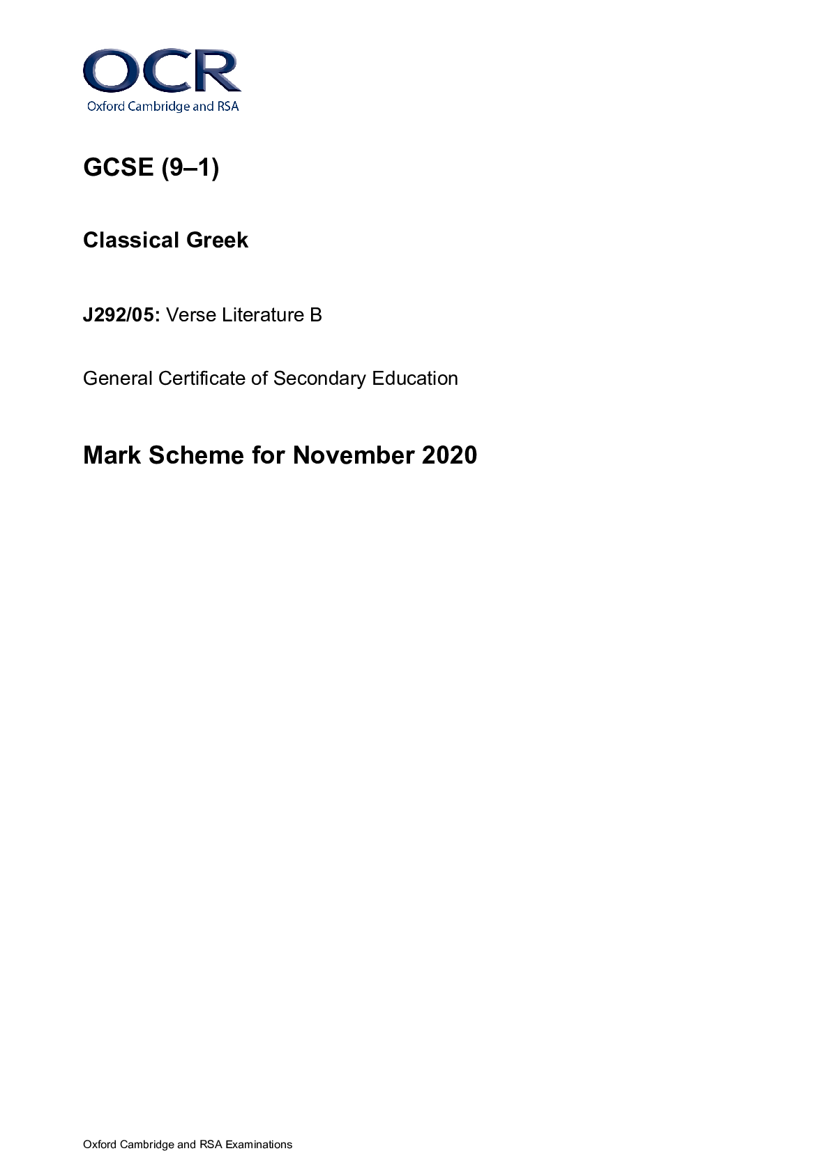 Greek > GCSE MARK SCHEME > GCSE (9–1) Classical Greek J292/05: Verse Literature B General Certificate of Secondary Education Mark Scheme for November 2020 (All)
