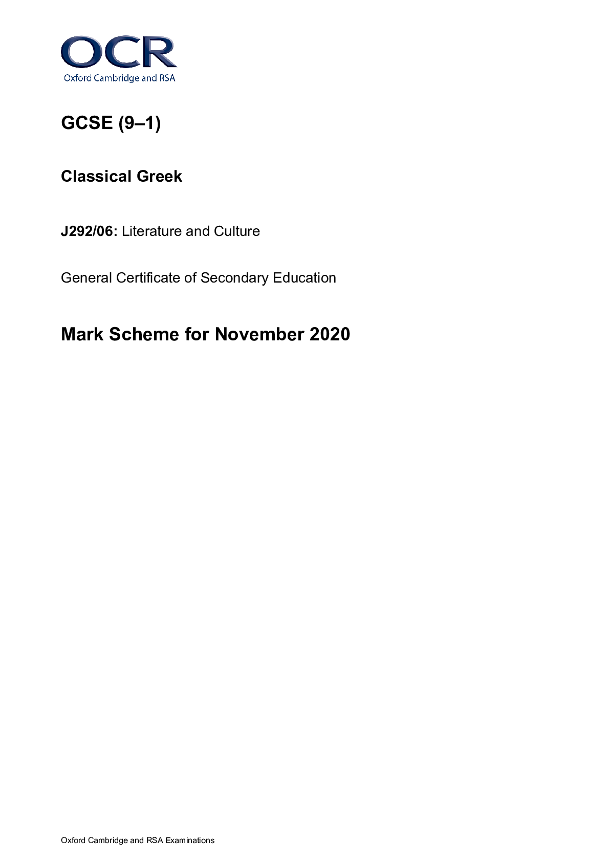 Greek > GCSE MARK SCHEME > GCSE (9–1) Classical Greek J292/06: Literature and Culture General Certificate of Secondary Education Mark Scheme for November 2020 (All)