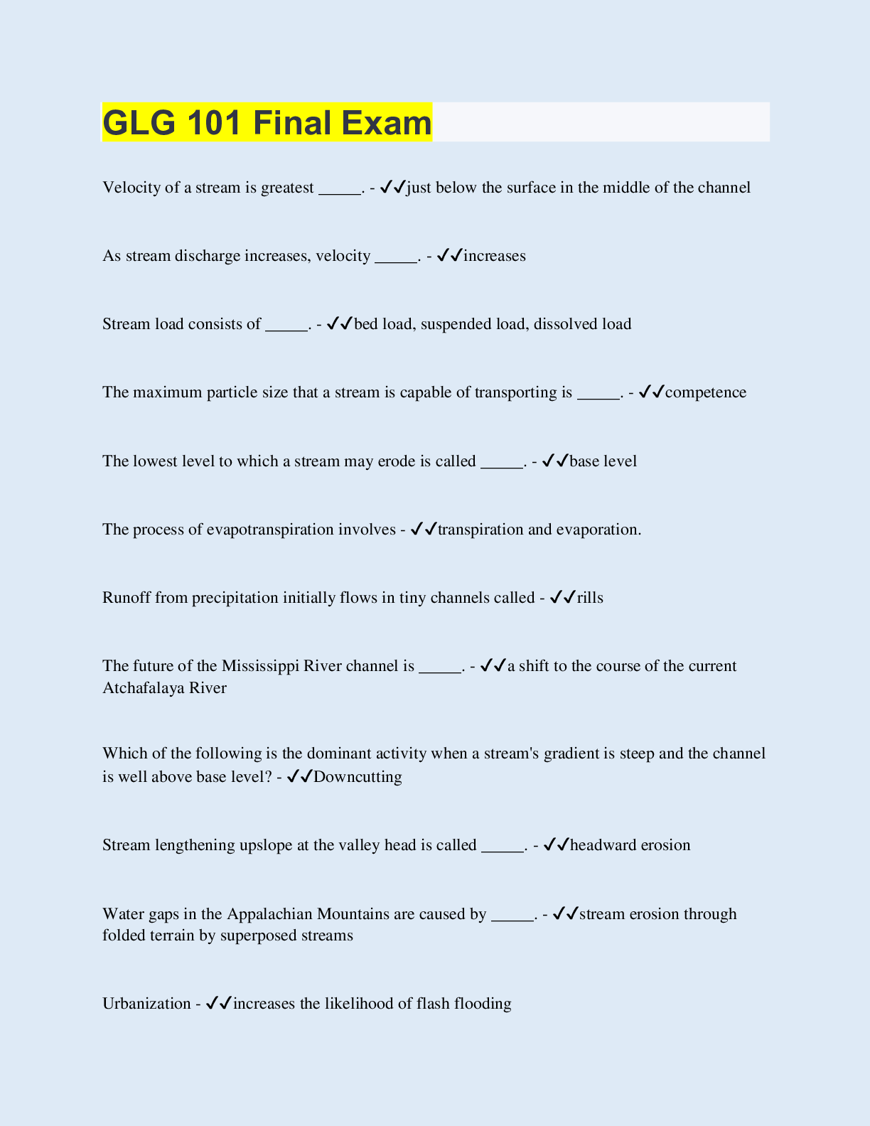 Geography > EXAMs > GLG 101 Final Exam | 175 Questions with 100% Correct Answers | Updated & Verified | 20 Pages (All)