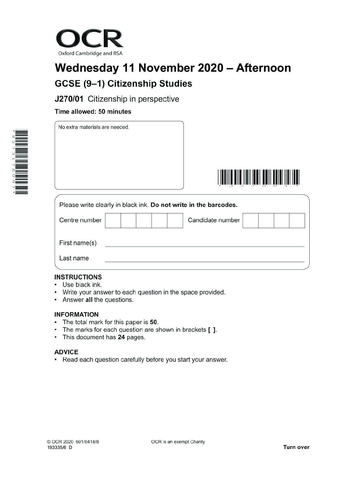 Geography > AS Level Question Paper > Citizenship Studies J270/02: Citizenship in action General Certificate of Secondary Education QUESTION PAPER for November 2020 (All)