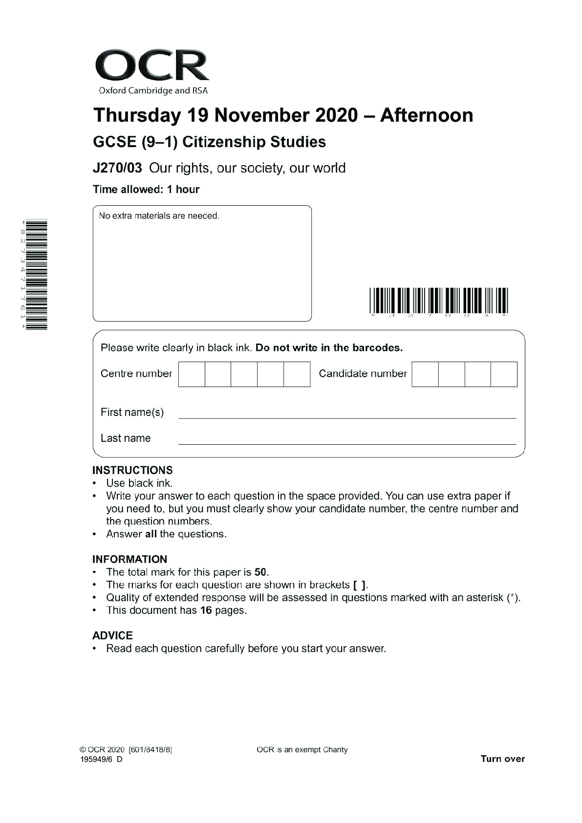 Geography > AS Level Question Paper > Citizenship Studies J270/03: Our rights, our society, our world General Certificate of Secondary Education QUESTION PAPER for November 2020 (All)