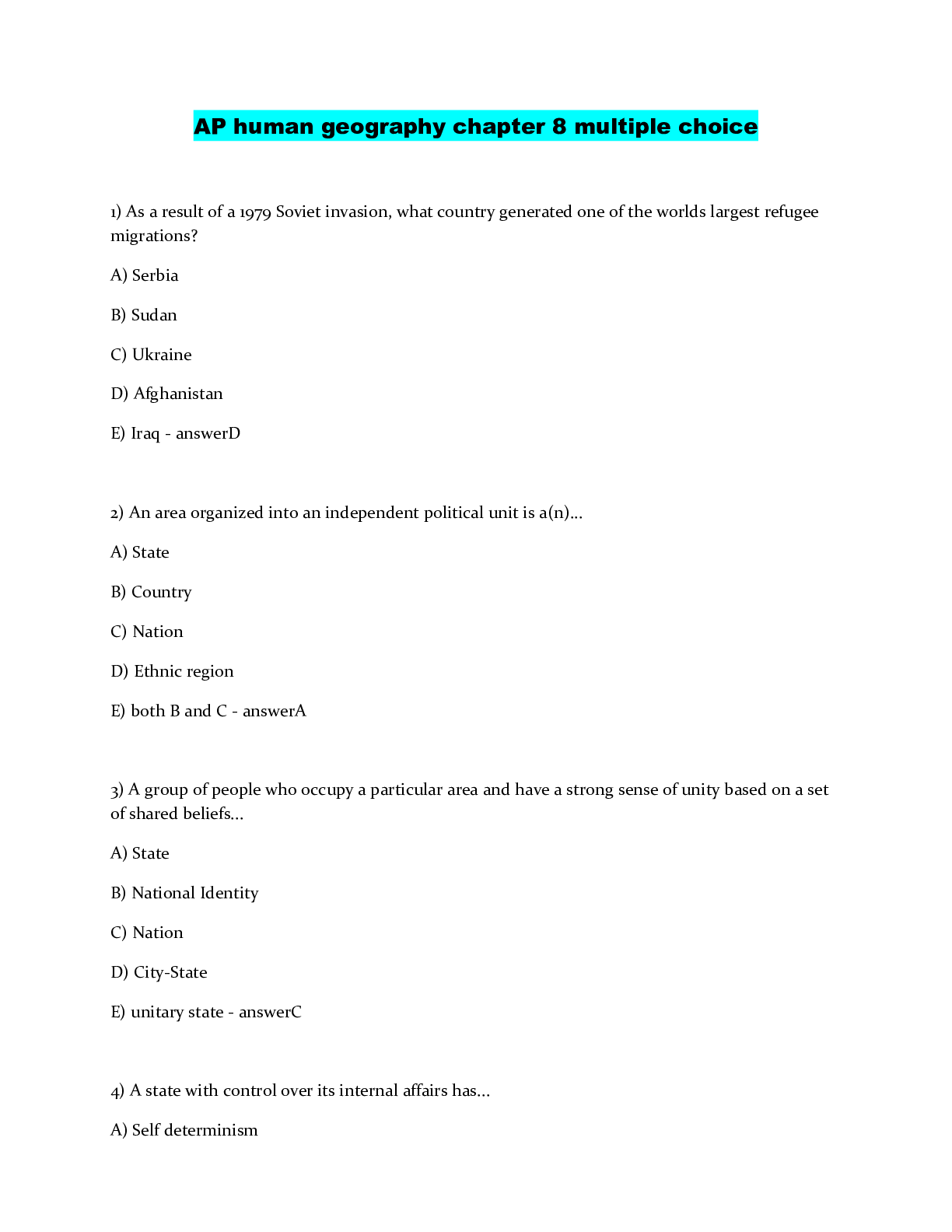 Geography > QUESTIONS & ANSWERS > AP human geography chapter 8 multiple choice (All)