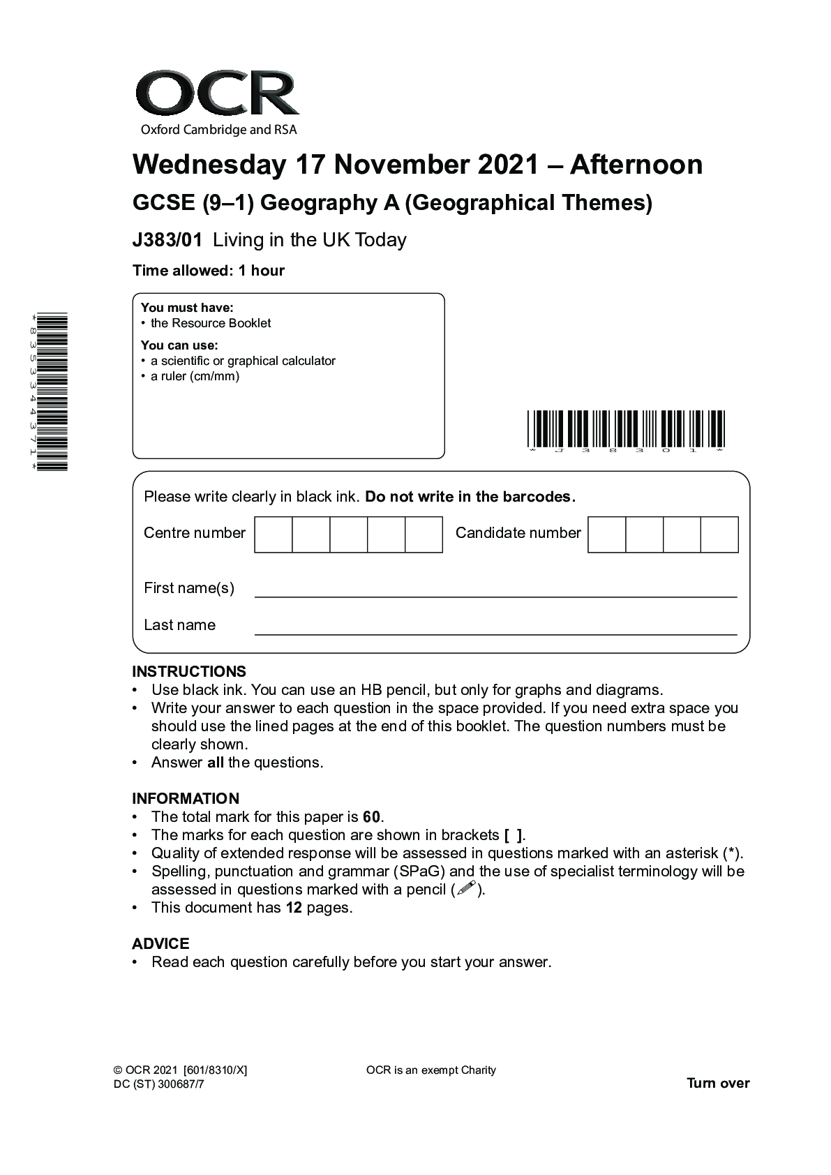 Geography > Higher Education > GCSE (9–1) Geography A_J383/01 Question Paper Oct 2021 | Living in the UK Today (All)