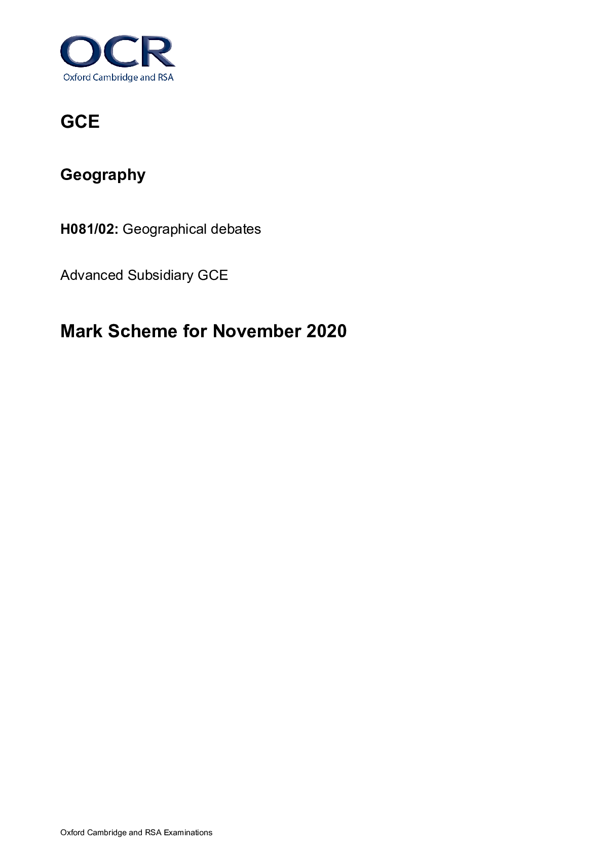 Geography > AS Mark Scheme > GCE Geography H081/02: Geographical debates Advanced Subsidiary GCE Mark Scheme for November 2020 (All)