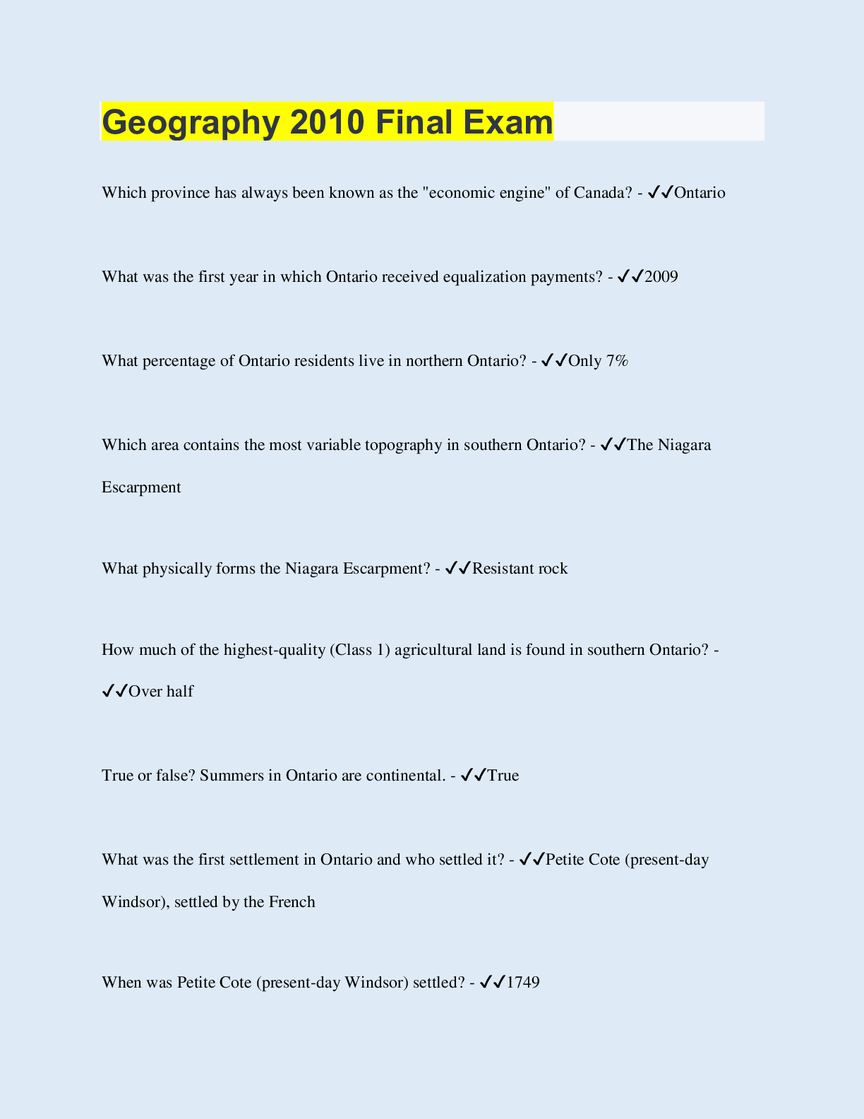 Geography > EXAMs > Geography 2010 Final Exam | 455 Questions with 100% Correct Answers | Updated 2023 | 64 Pages (All)