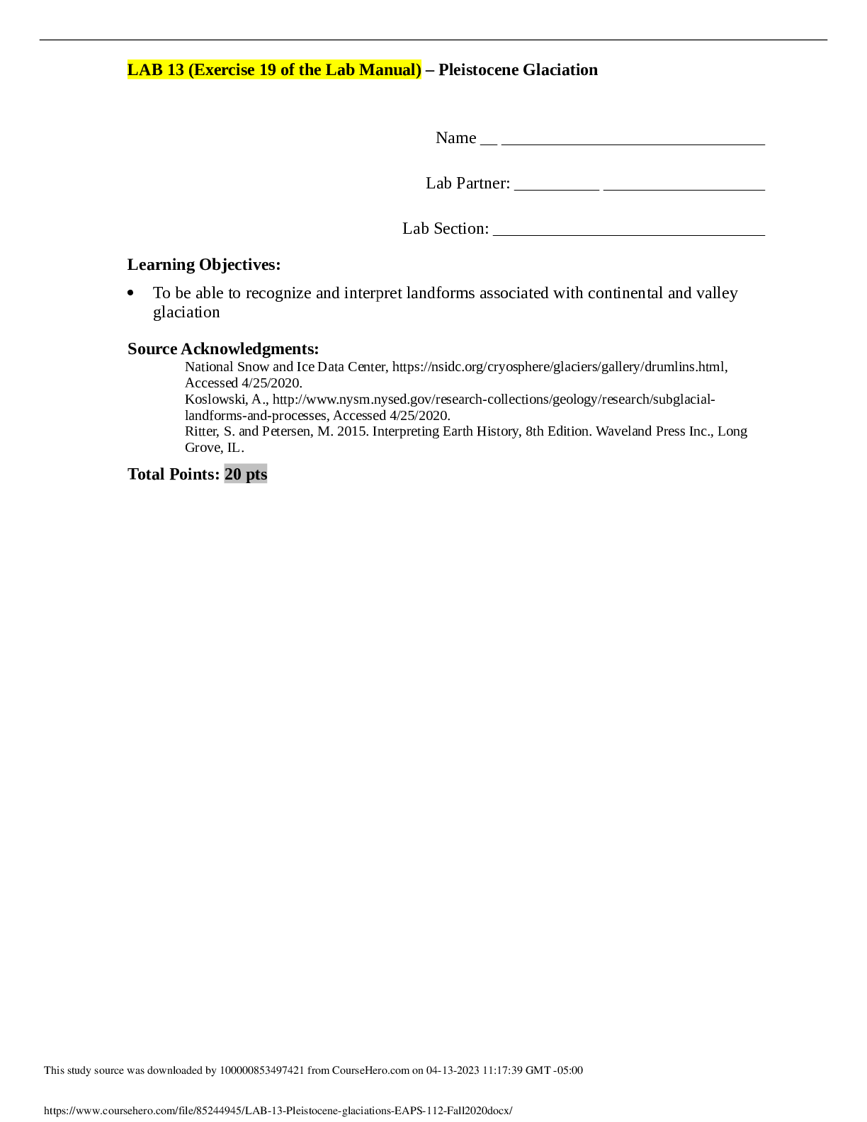 Geography > QUESTIONS & ANSWERS > EAPS 112 Earth History - Purdue University. LAB 13 Pleistocene glaciations EAPS 112 Fall 2022. Q&A (All)