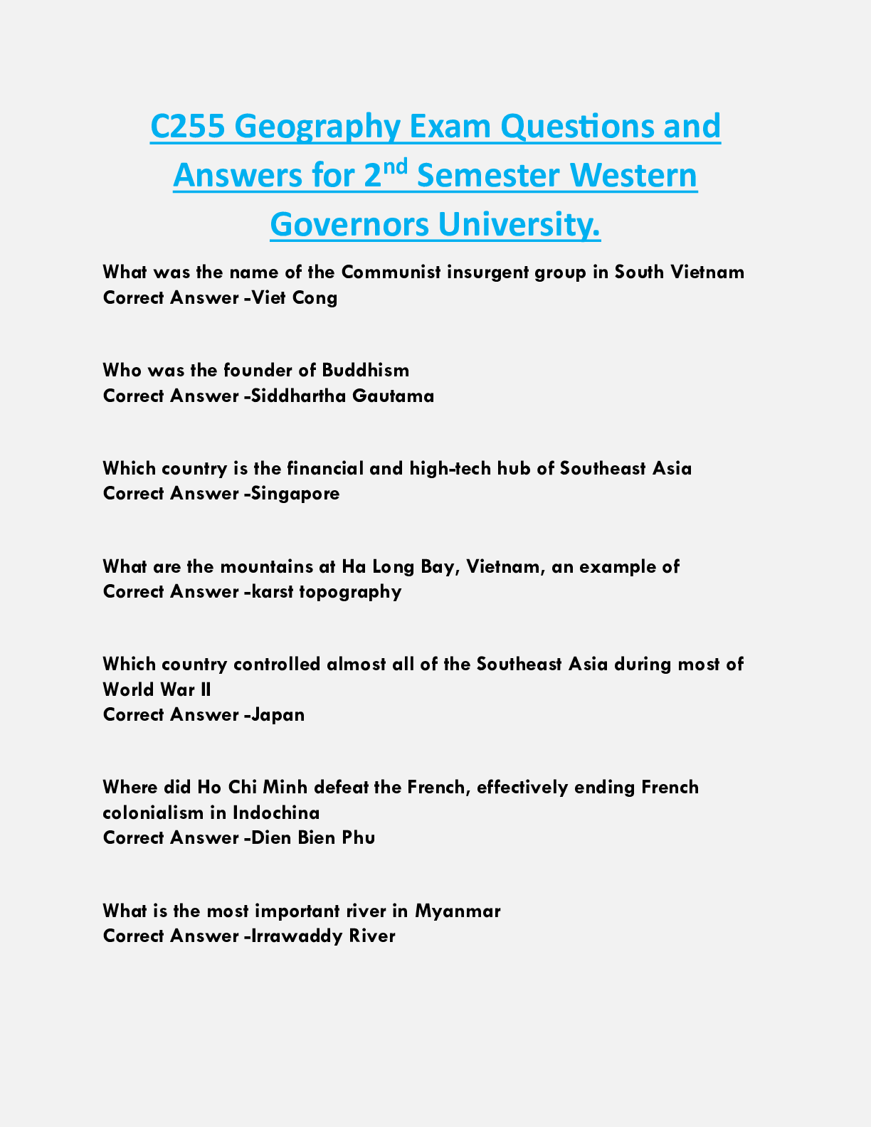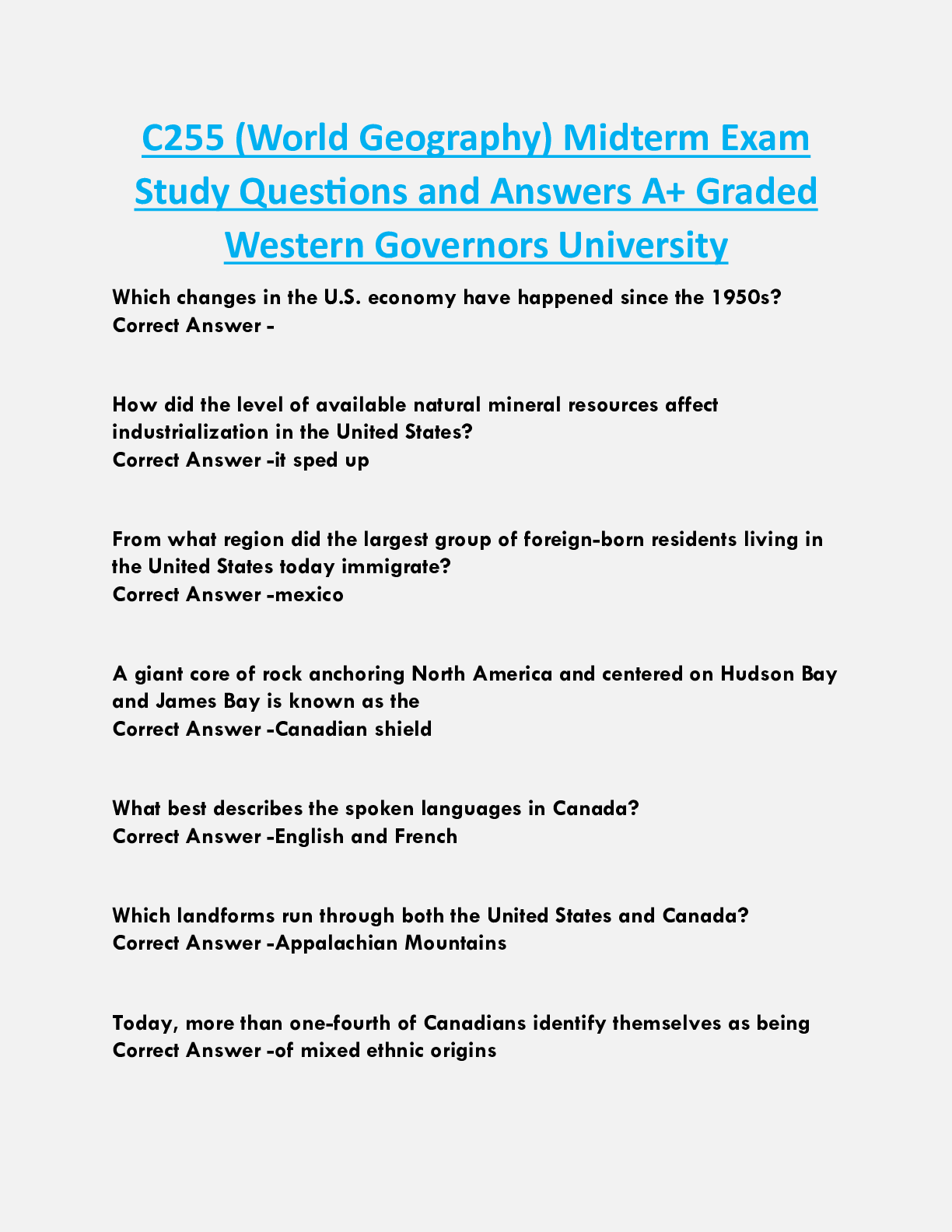 Geography > EXAMs > C255 Geography Exam Questions and Answers for 2nd Semester Western Governors University (All)