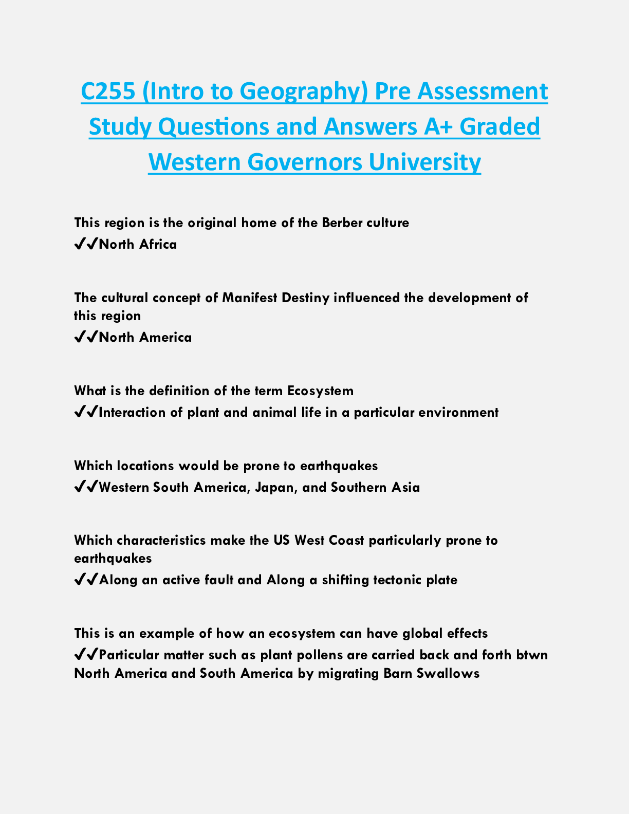 Geography > EXAMs > C255 (Intro to Geography) Pre Assessment Study Questions and Answers A+ Graded Western Governors University (All)