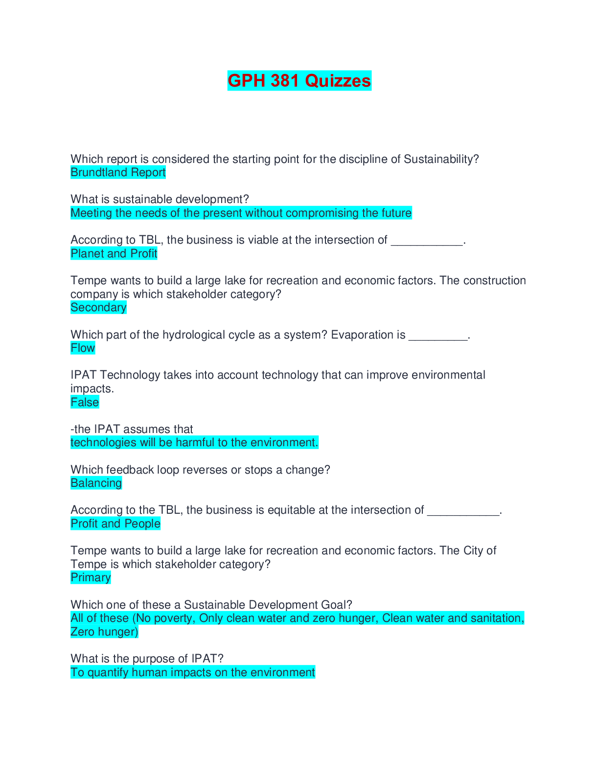 Geography > EXAMs > GPH 381 Quizzes | Questions with Verified Answers (All)