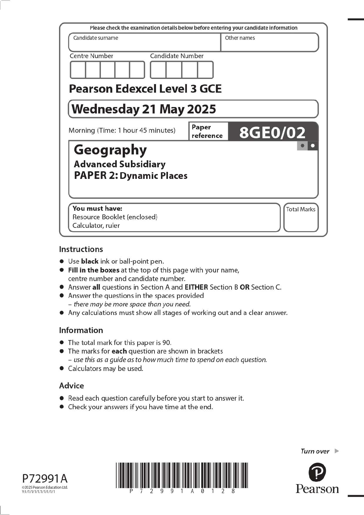 Geography > Edexcel > 2025 Pearson Edexcel Level 3 GCE 8GE0/02 Geography Advanced Subsidiary PAPER 2: Dynamic Places Question Paper + Mark Scheme (All)