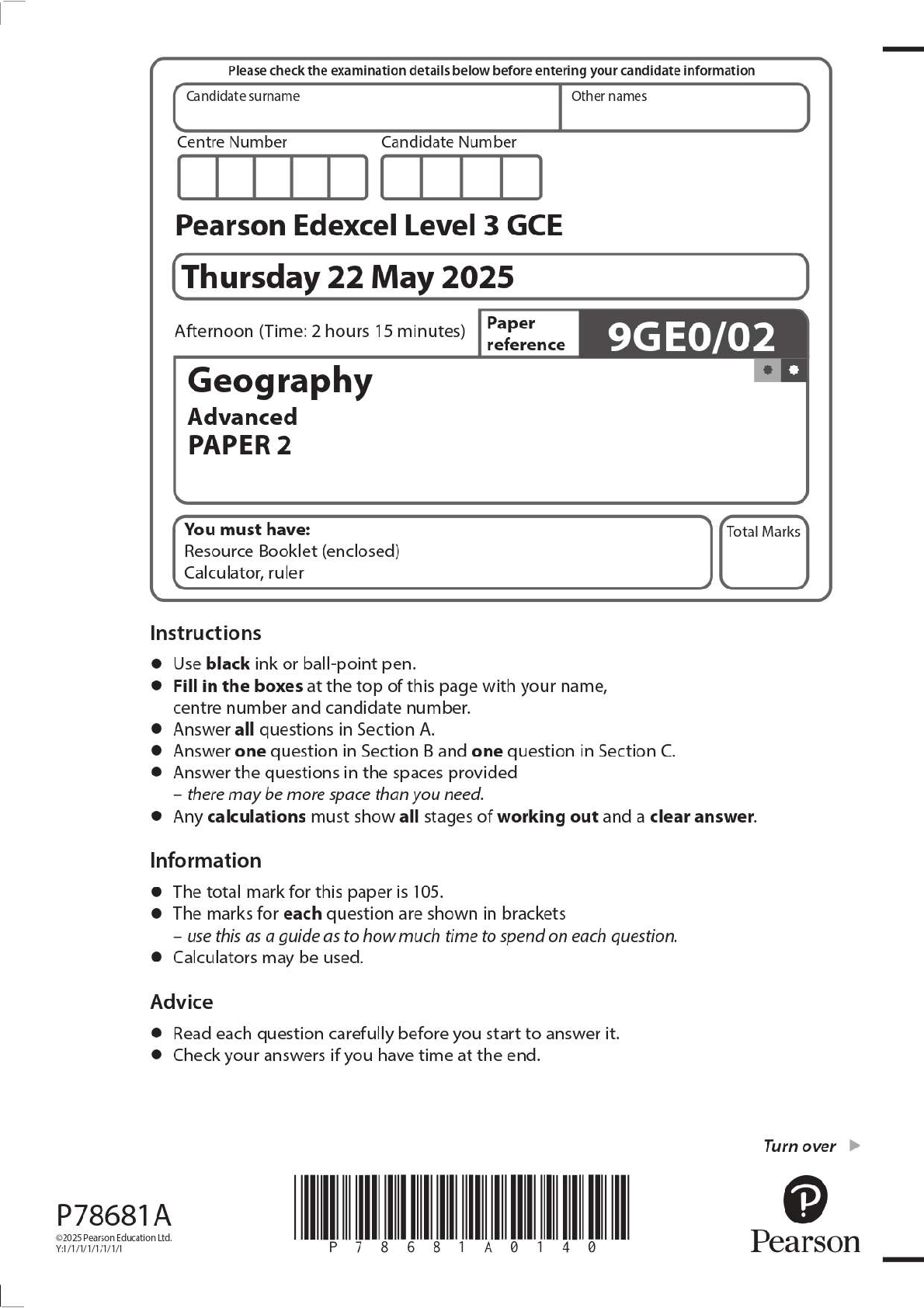 Geography > Edexcel > 2025 Pearson Edexcel Level 3 GCE 9GE0/02 Geography Advanced PAPER 2 Question Paper + Mark Scheme (All)