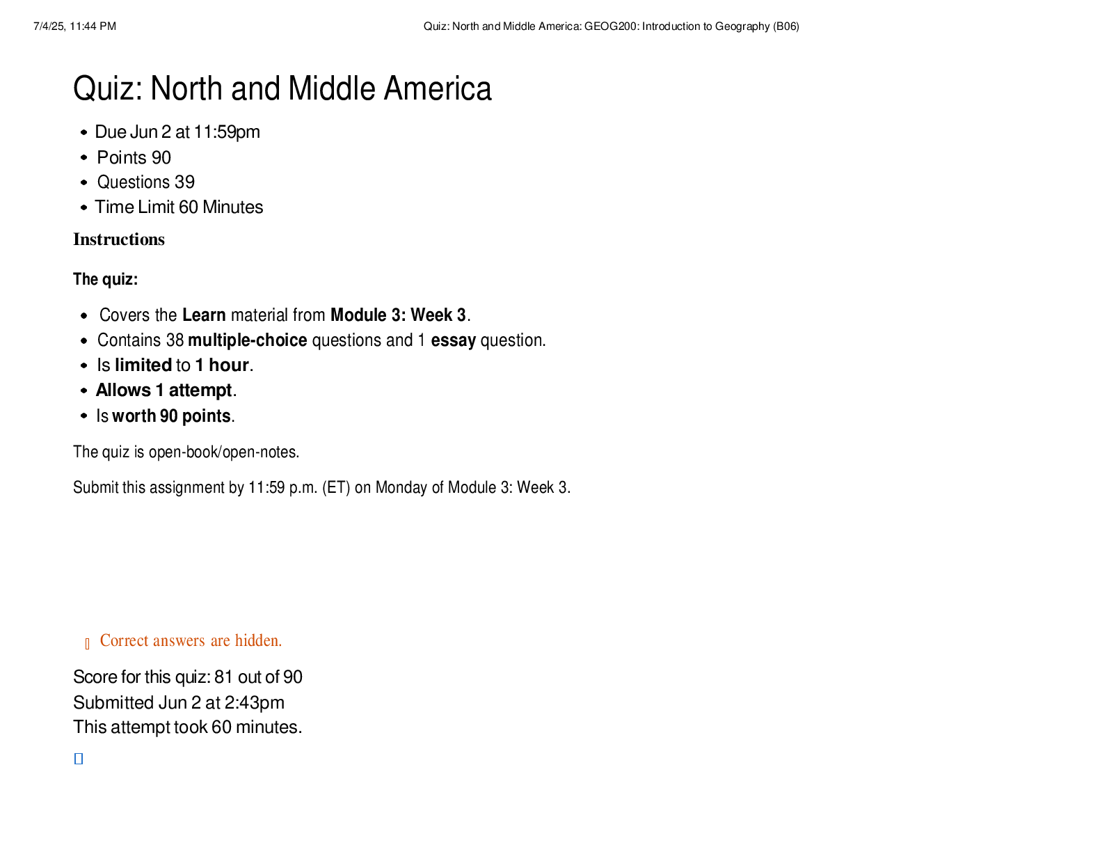 Geography > EXAMs > GEOG 200 Quiz: North and Middle America | Score 81/90 | Liberty University (All)