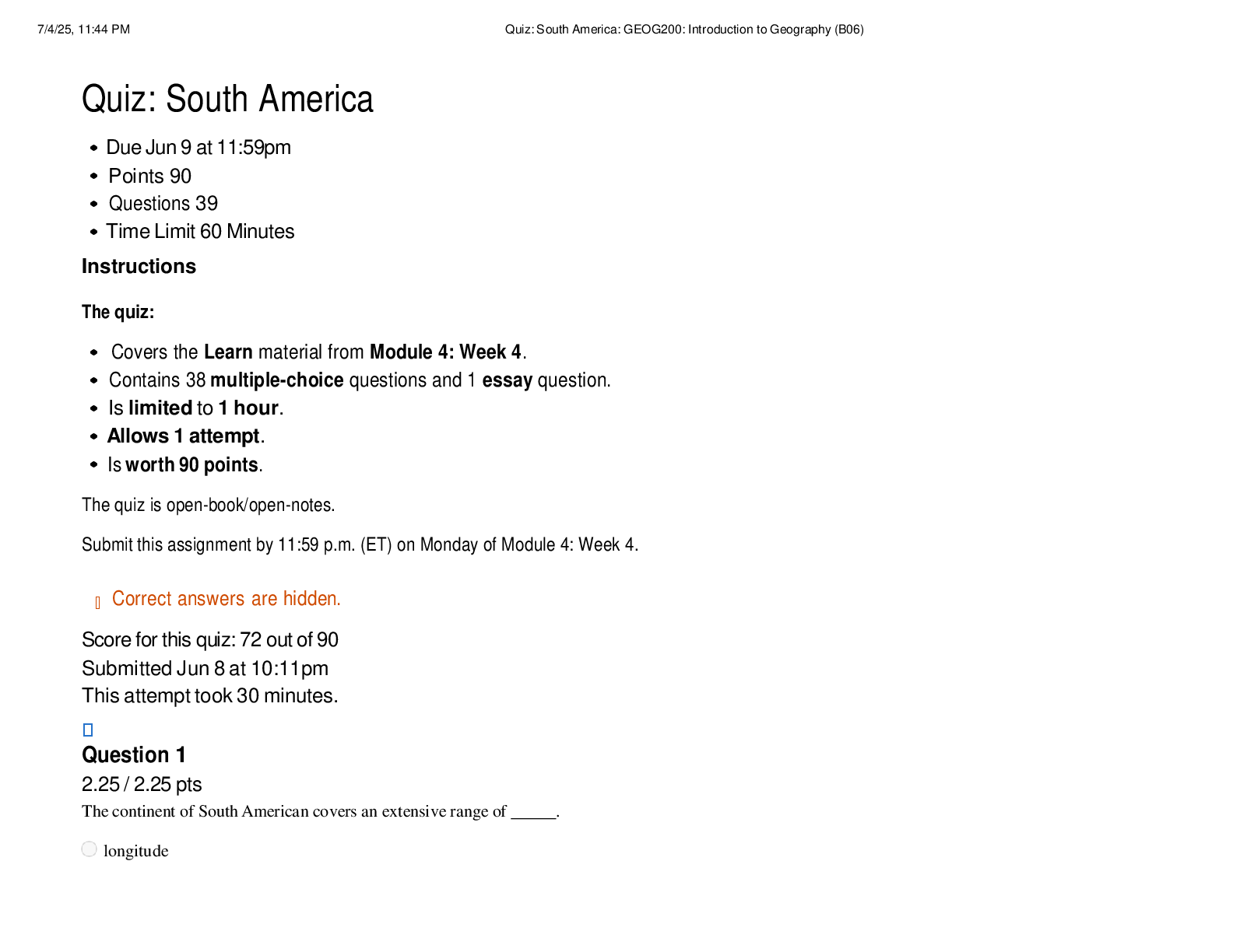 Geography > EXAMs > GEOG 200 Quiz: South America | Score 72/90 | Liberty University (All)