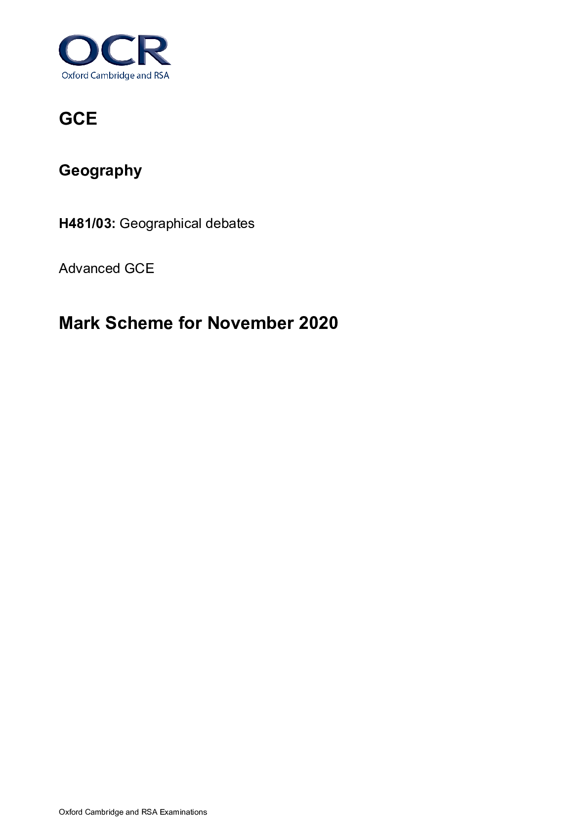 Geography > A/As Level Mark Scheme > A Level Geography_H481/03 Mark Scheme Nov 2020 | Geographical Debates (All)