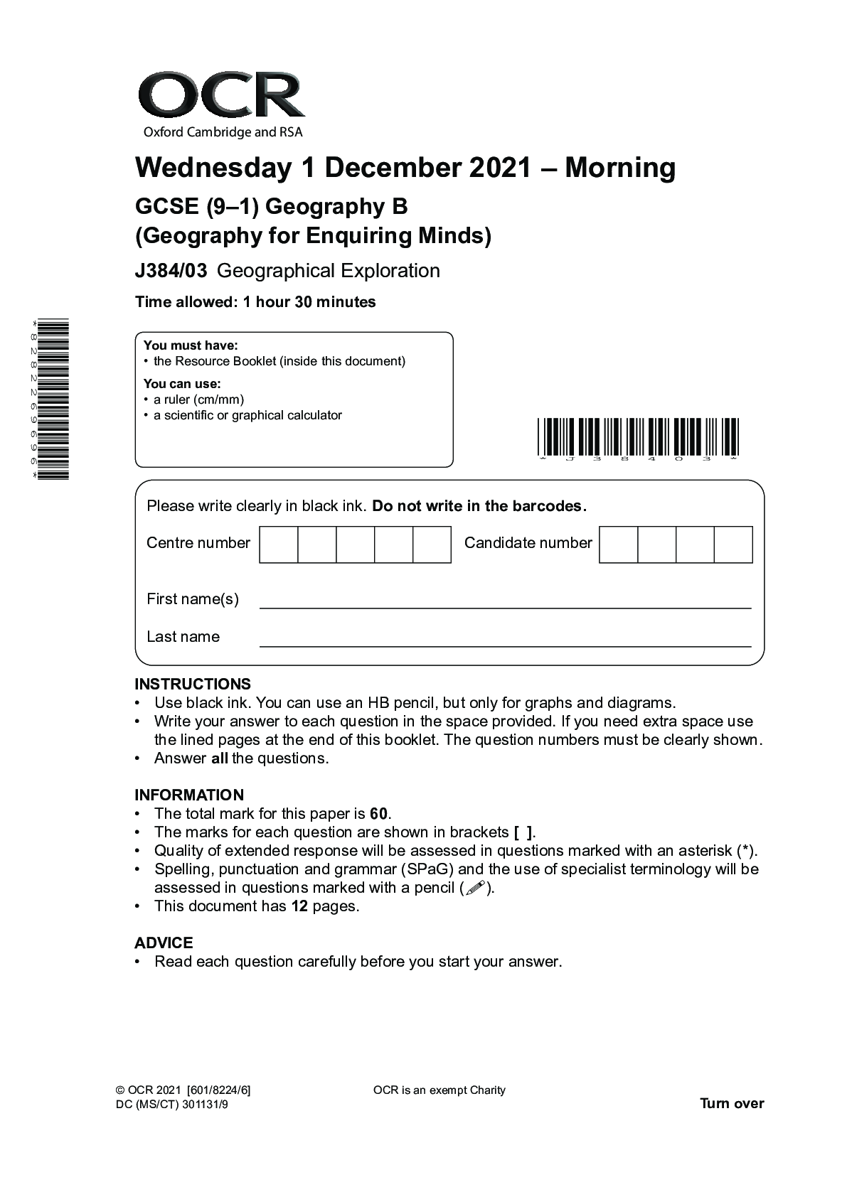 Geography > Higher Education > GCSE (9-1) Geography B _J384/03 Question Paper Nov 2020 | Geographical Exploration (All)