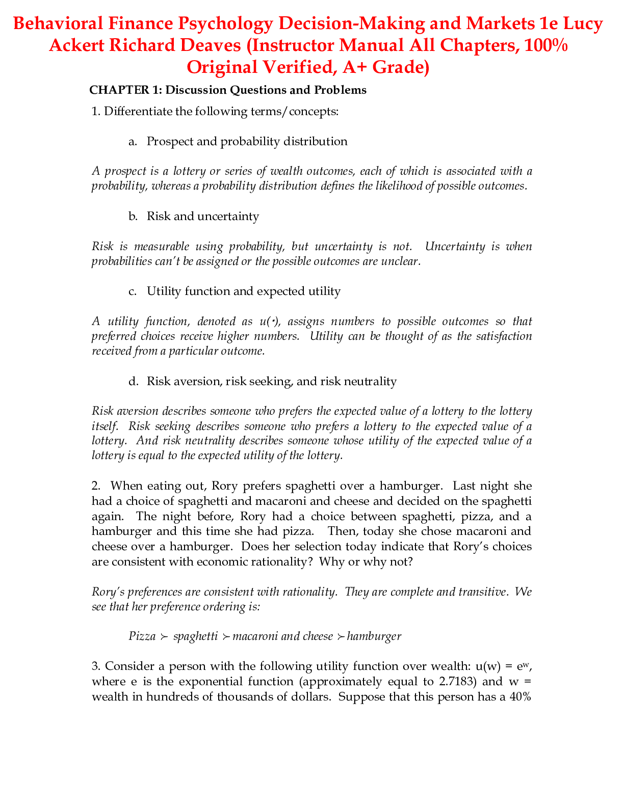 Applied Psychology > INSTRUCTOR MANUALS > Instructor’s Manual for Behavioral Finance Psychology Decision-Making and Markets 1st Edition By Lucy Ackert Richard Deaves (All Chapters, 100% Original Verified, A+ Grade) (All)