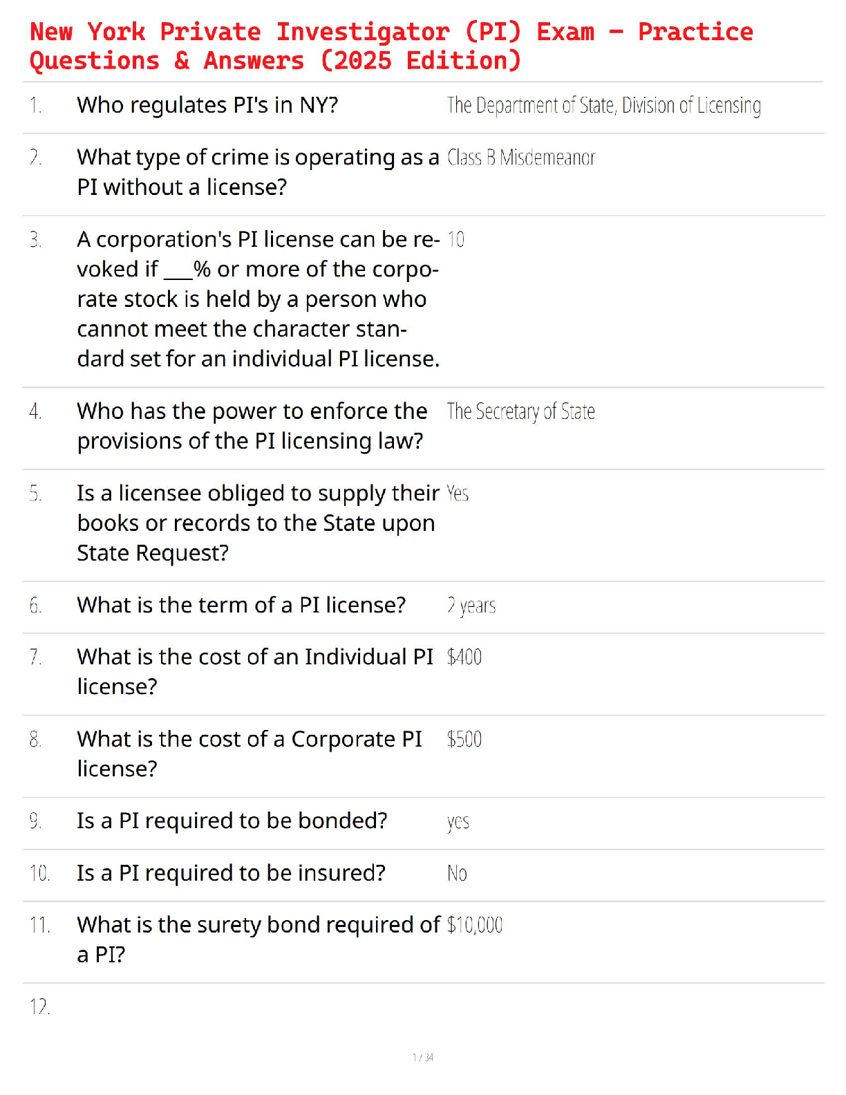 Forensic and Criminal Investigation > STUDY GUIDE > New York Private Investigator (PI) Exam – Practice Questions & Answers (2025 Edition) (All)