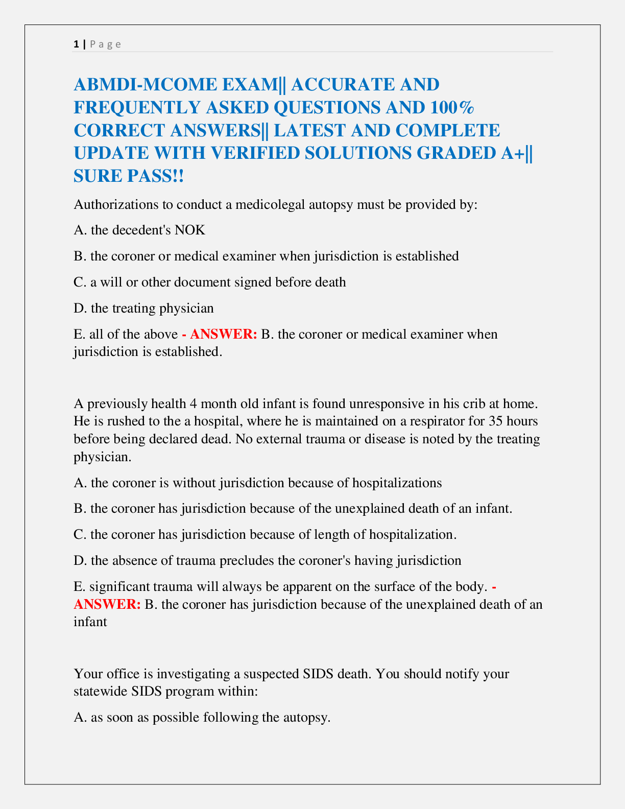 Forensic and Criminal Investigation > EXAM > ABMDI-MCOME EXAM|| ACCURATE AND FREQUENTLY ASKED QUESTIONS AND 100% CORRECT ANSWERS|| LATEST AND COMPLETE UPDATE WITH VERIFIED SOLUTIONS GRADED A+|| SURE PASS!! (All)
