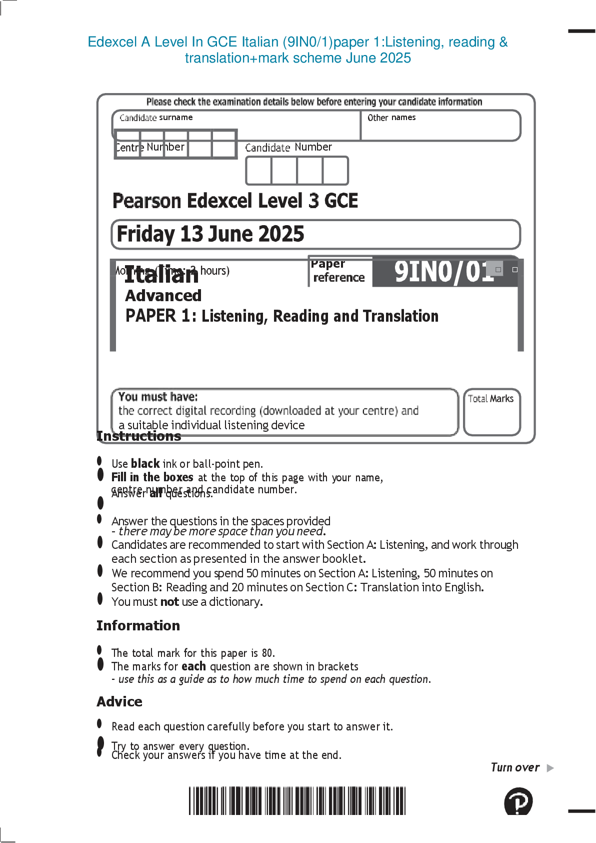 Italian > Edexcel > Edexcel A Level In GCE Italian (9IN0/1)paper 1:Listening, reading & translation+mark scheme June 2025 (All)