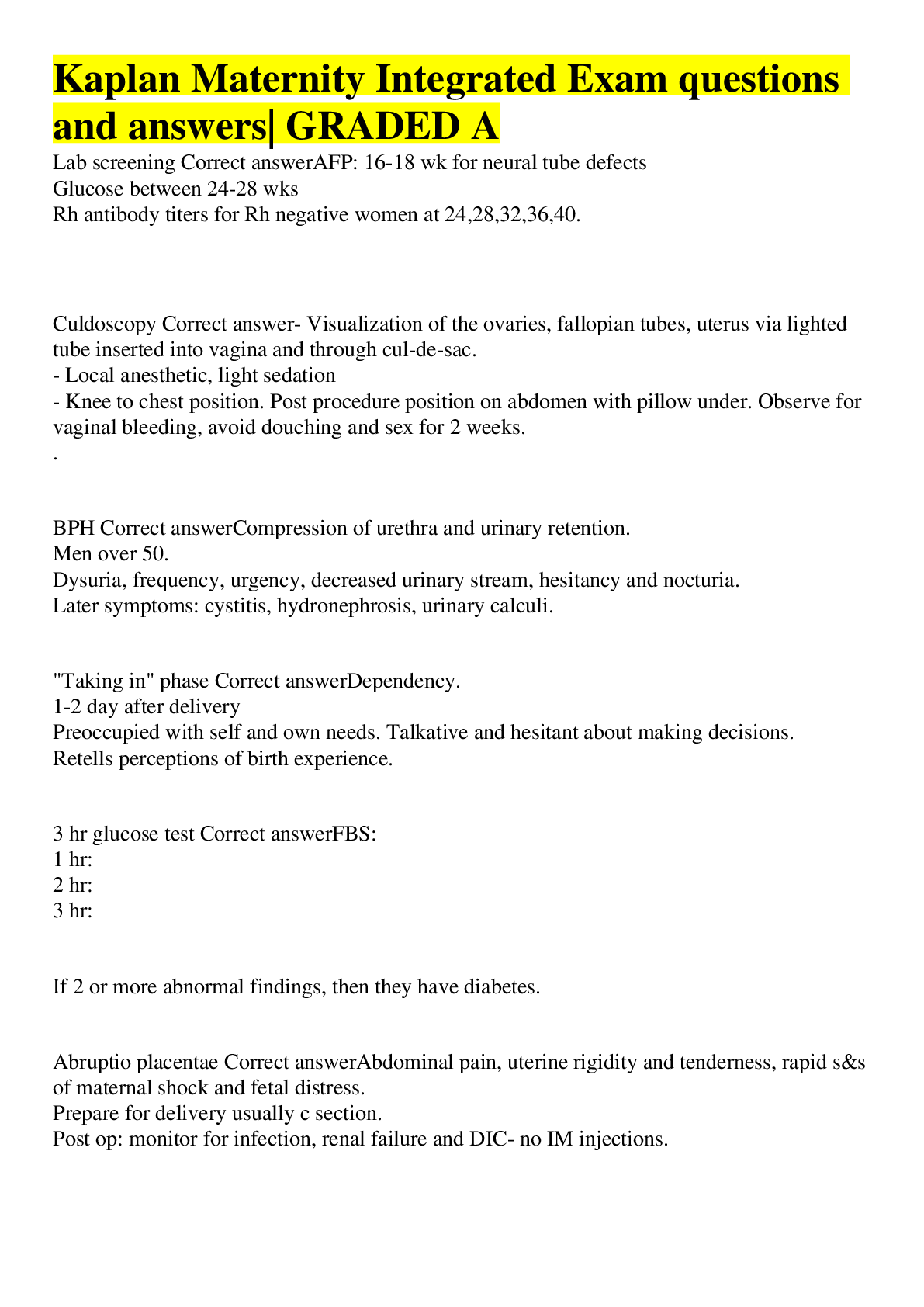 Health Care > EXAM > Kaplan Maternity Integrated Exam questions and answers| GRADED A (All)