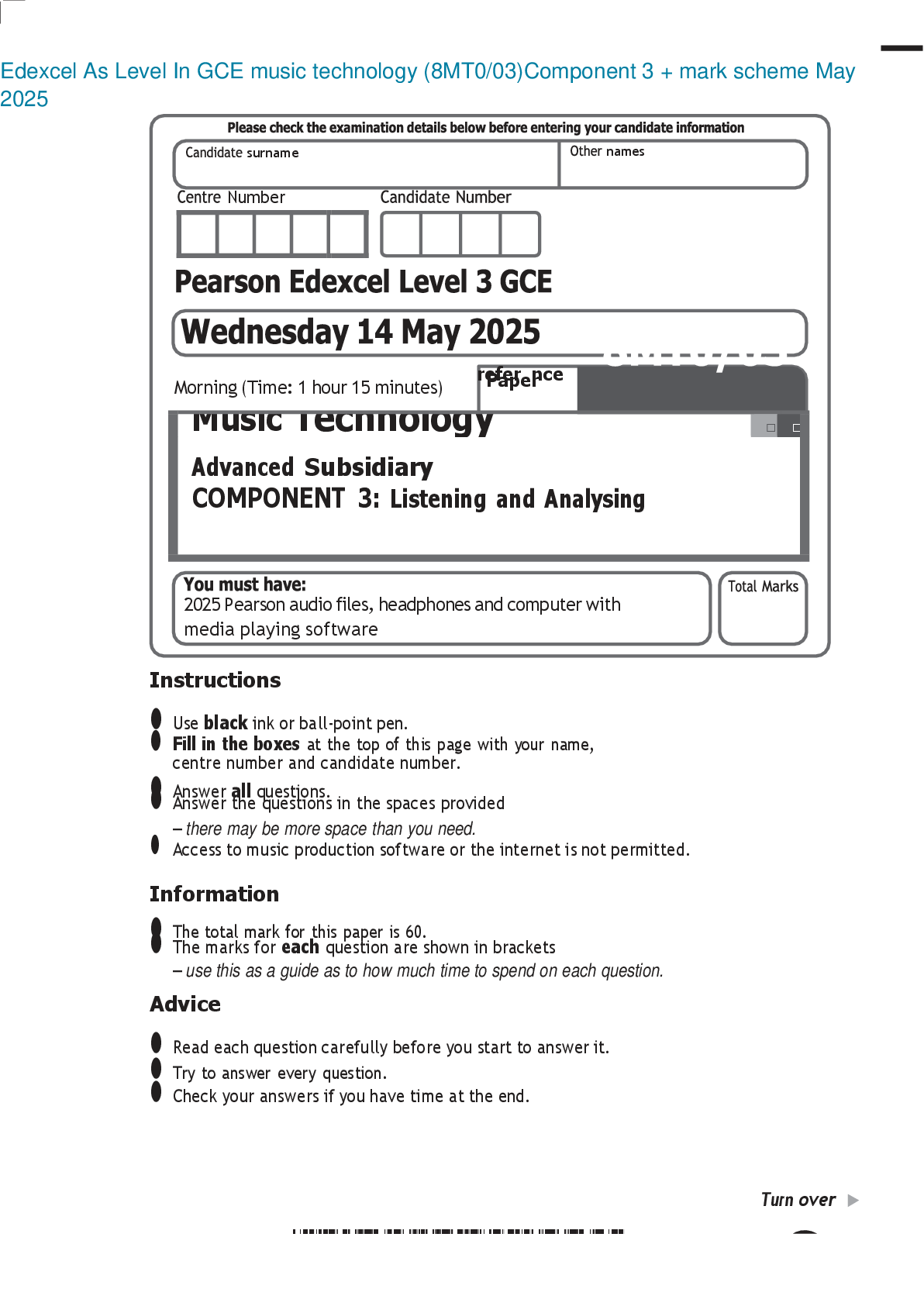Music Technology > Edexcel > Edexcel As Level In GCE music technology (8MT0/03)Component 3 + mark scheme May 2025 (All)