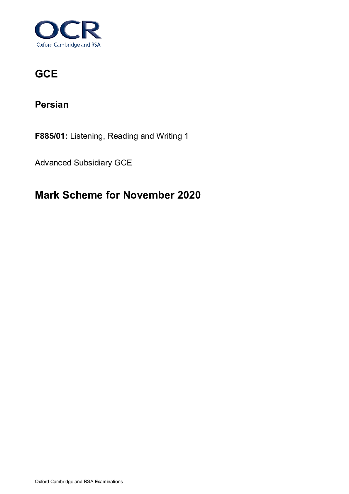 Persian > MARK SCHEMES > GCE Persian F885/01: Listening, Reading and Writing 1 Advanced Subsidiary GCE Mark Scheme for November 2020 (All)