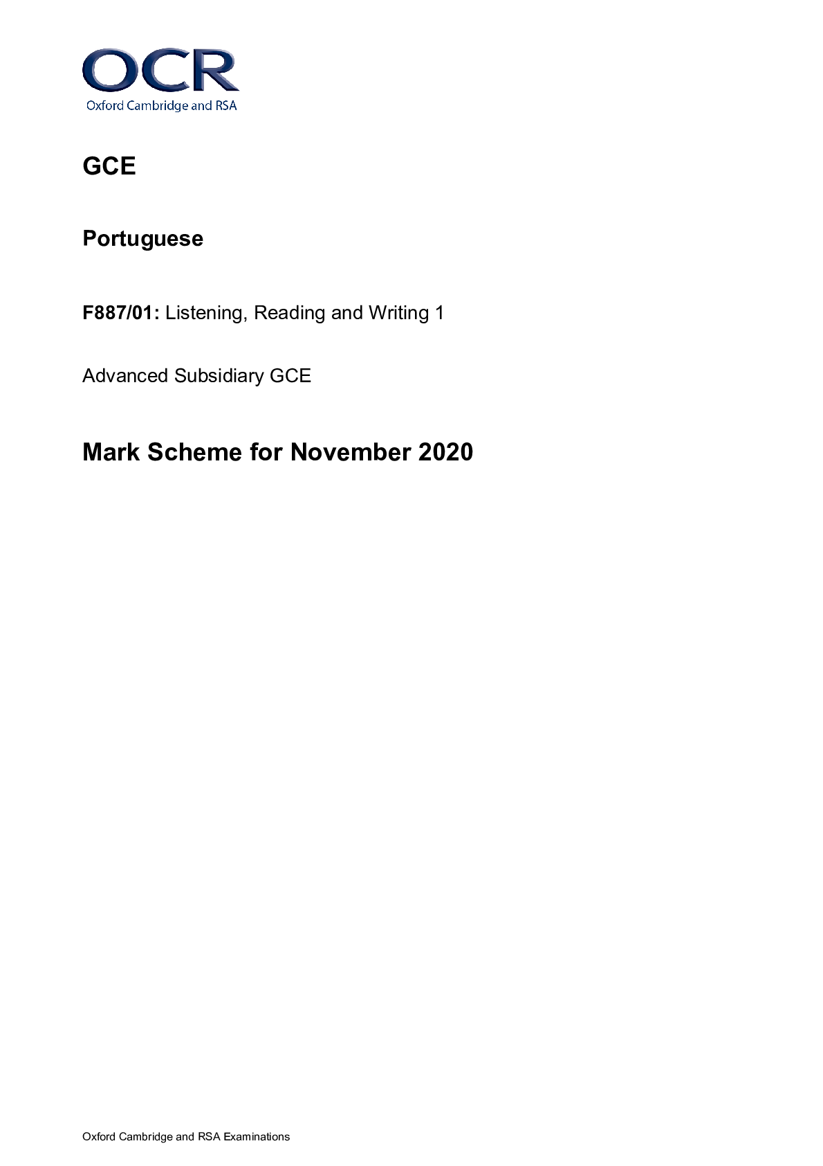 Portuguese > MARK SCHEMES > GCE Portuguese F887/01: Listening, Reading and Writing 1 Advanced Subsidiary GCE Mark Scheme for November 2020 (All)