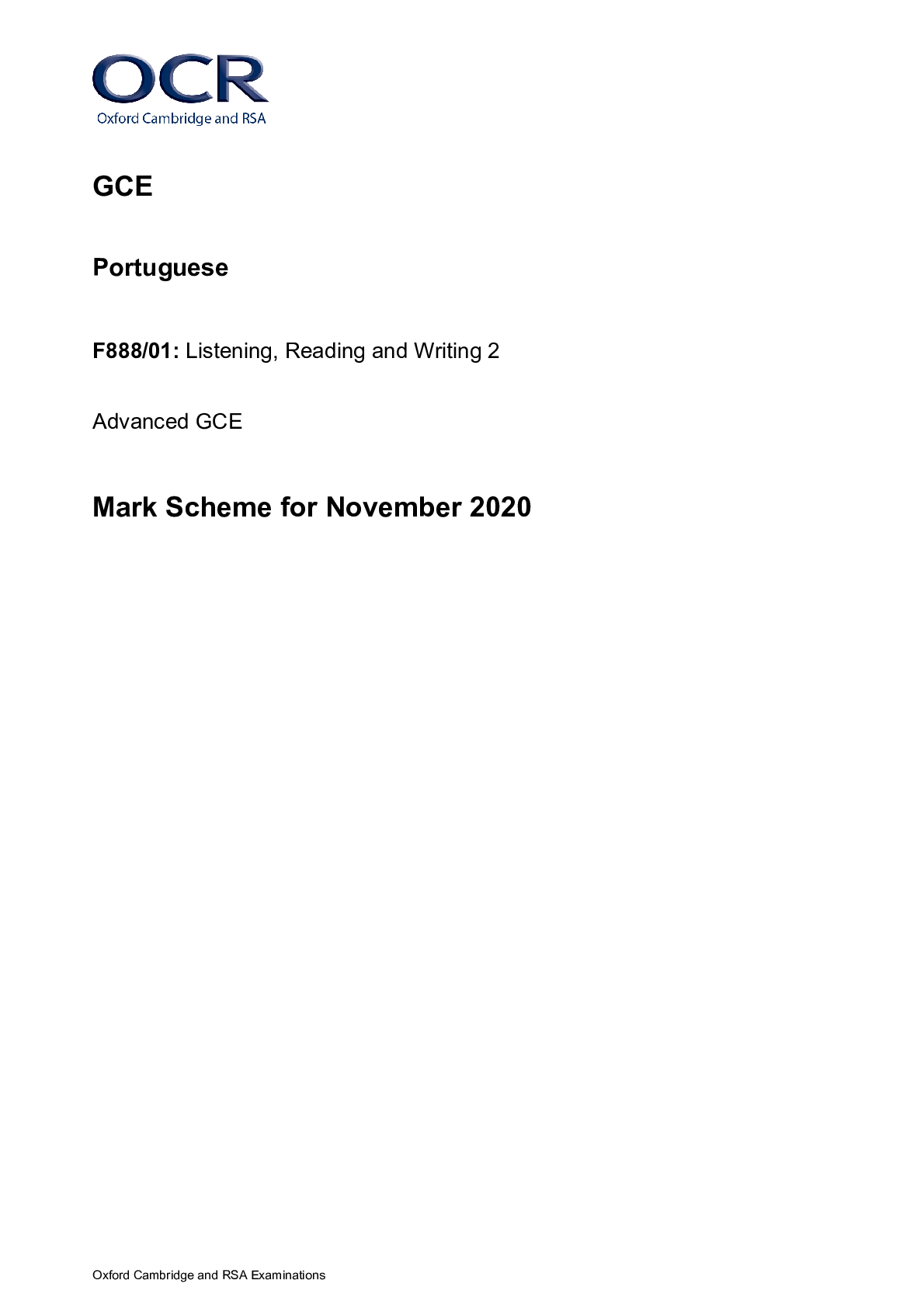 Portuguese > MARK SCHEMES > GCE Portuguese F888/01: Listening, Reading and Writing 2 Advanced GCE Mark Scheme for November 2020 (All)