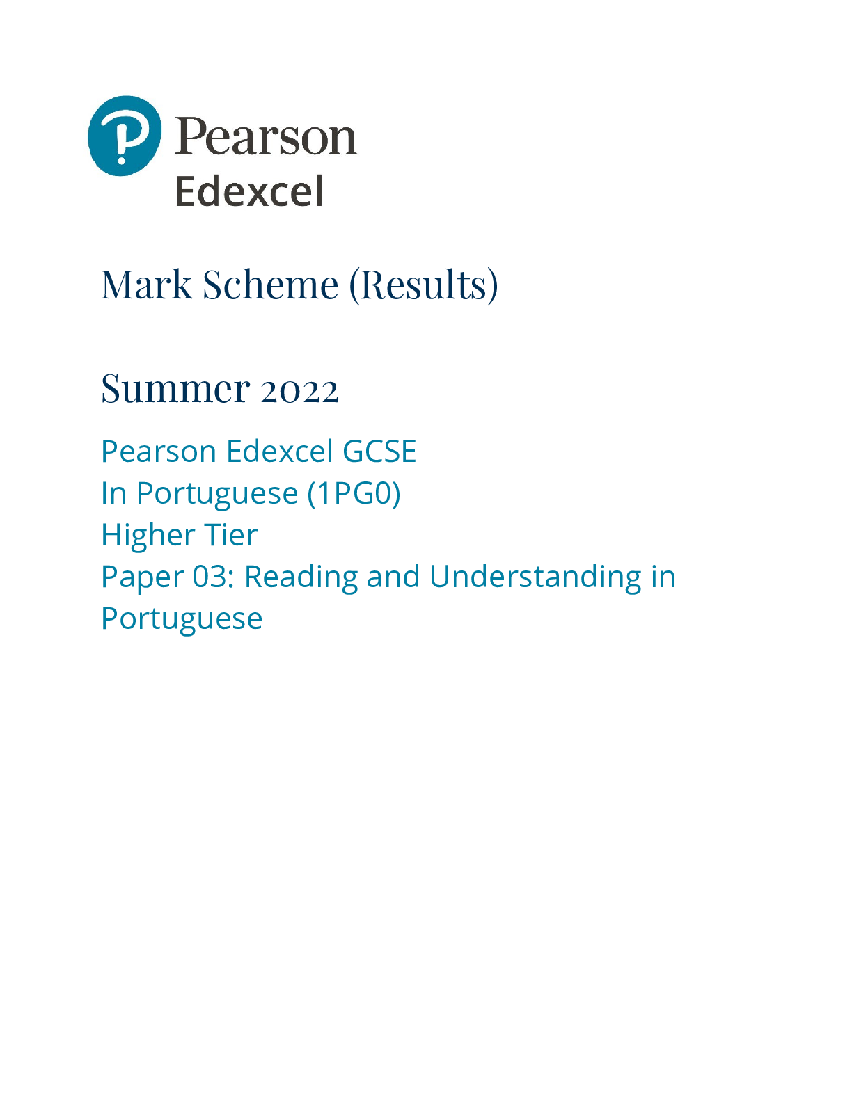 Portuguese > MARK SCHEMES > Mark Scheme (Results) Summer 2022 Pearson Edexcel GCSE In Portuguese (1PG0) Higher Tier Paper 03: Reading and Understanding in Portuguese Edexcel and BTEC Qualifications Edexcel and BTEC qualifications are awarded (All)