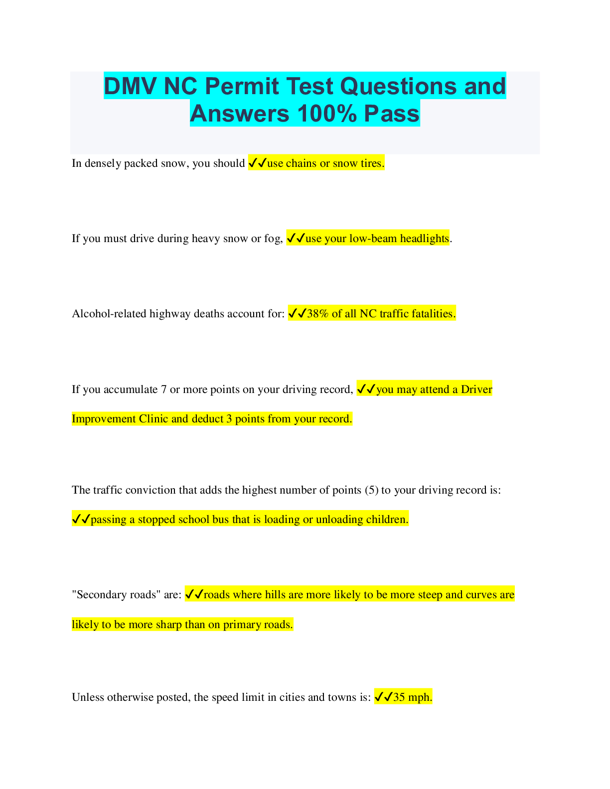 Driving Course > QUESTIONS & ANSWERS > DMV NC Permit Test Questions and Answers 100% Pass (All)