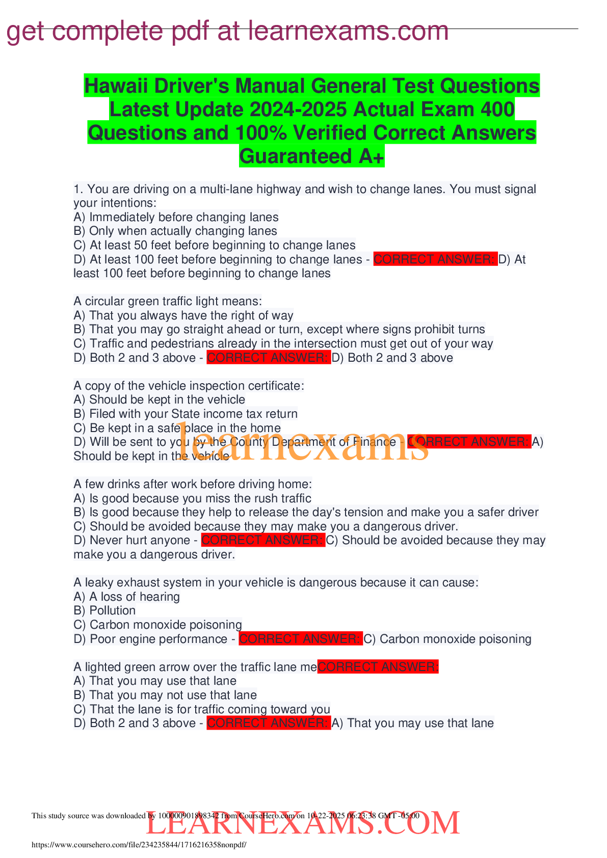 Driving Course > AQA > Hawaii Driver's Manual General Test Questions Latest Update 2024-2025 Actual Exam 400 Questions and 100% Verified Correct Answers Guaranteed A+ (All)