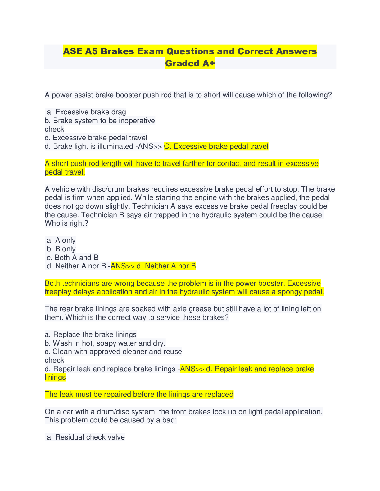 Driving Course > QUESTIONS & ANSWERS > ASE A5 Brakes Exam Questions and Correct Answers Graded A+ (All)