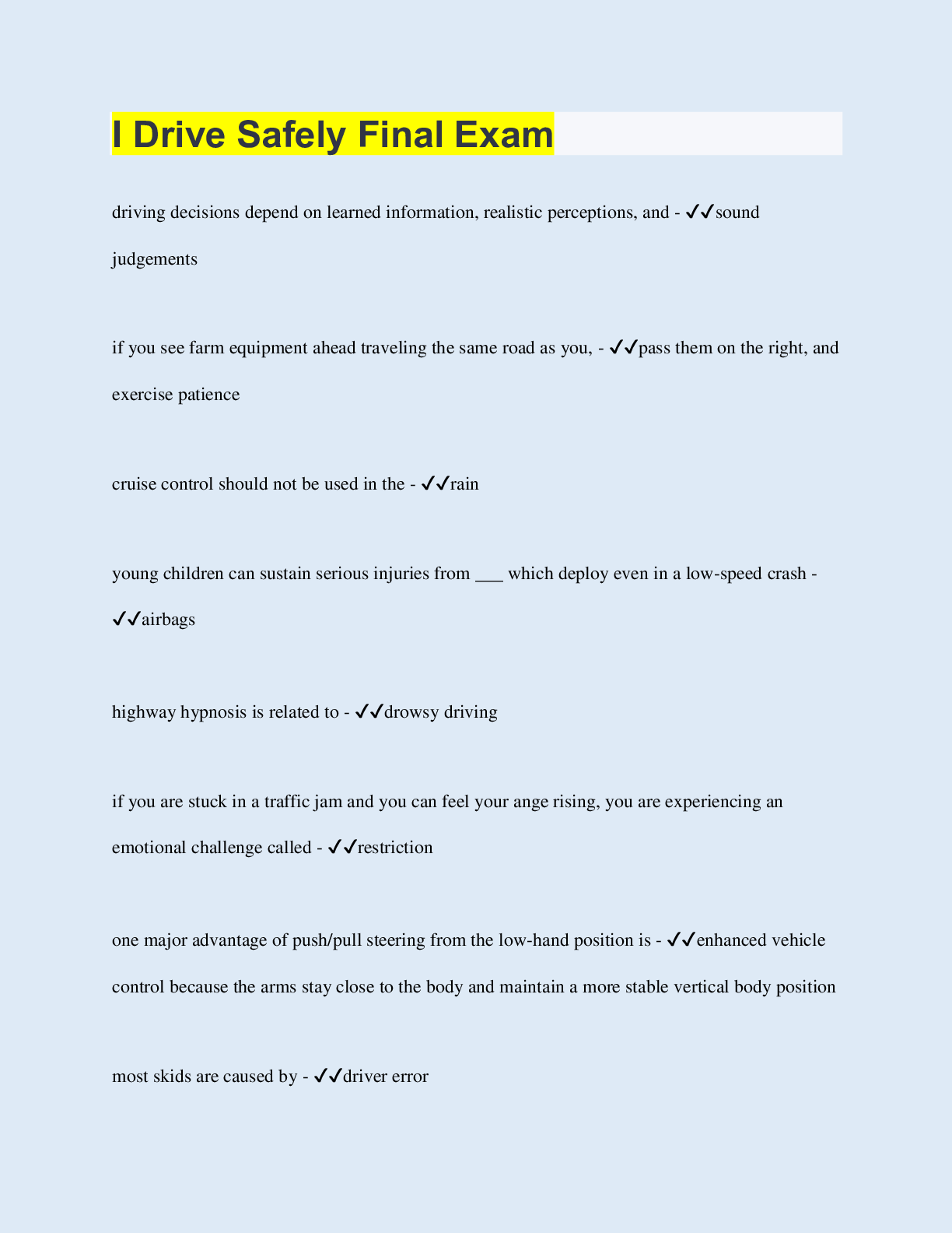 Driving Course > QUESTIONS & ANSWERS > I Drive Safely Final Exam (All)