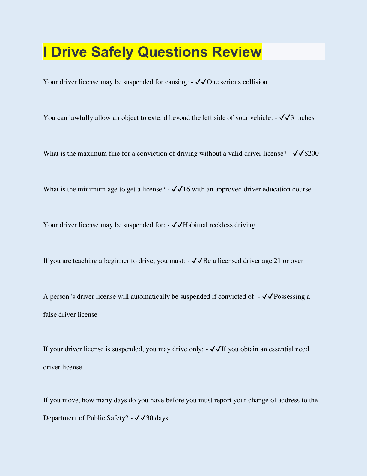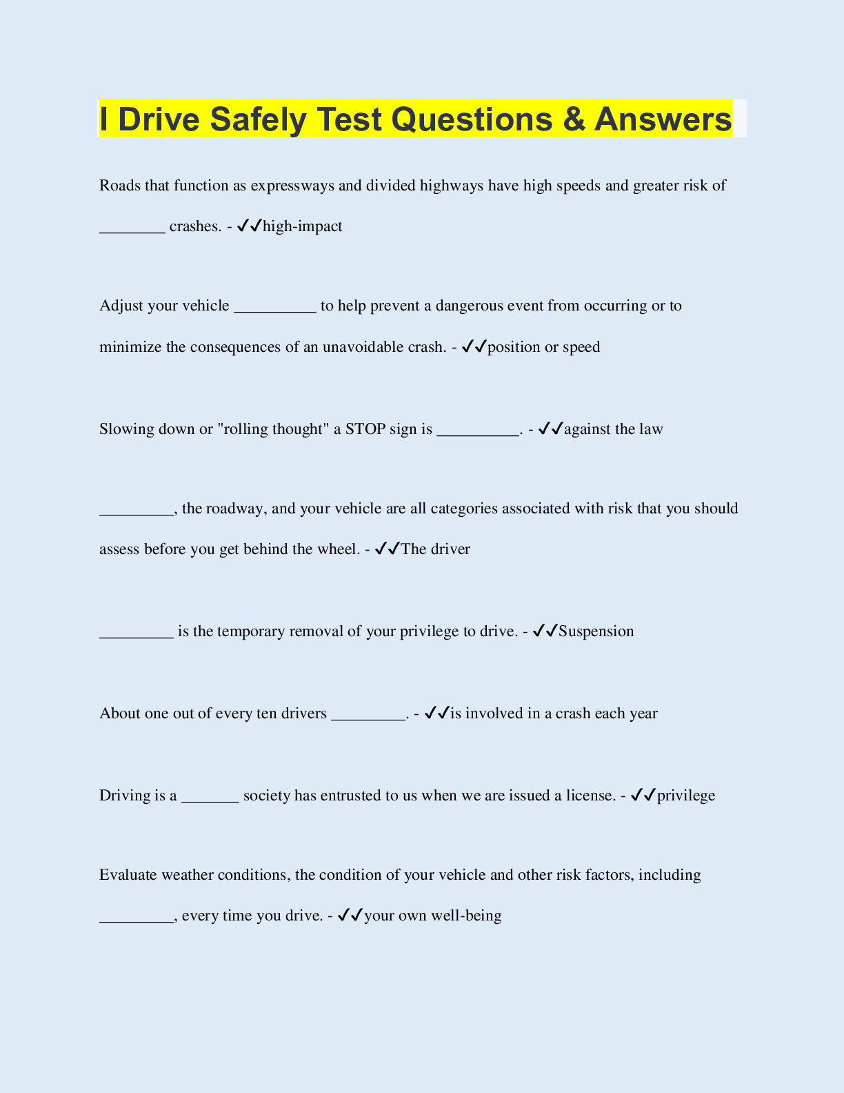 Driving Course > QUESTIONS & ANSWERS > I Drive Safely Test Questions & Answers (All)