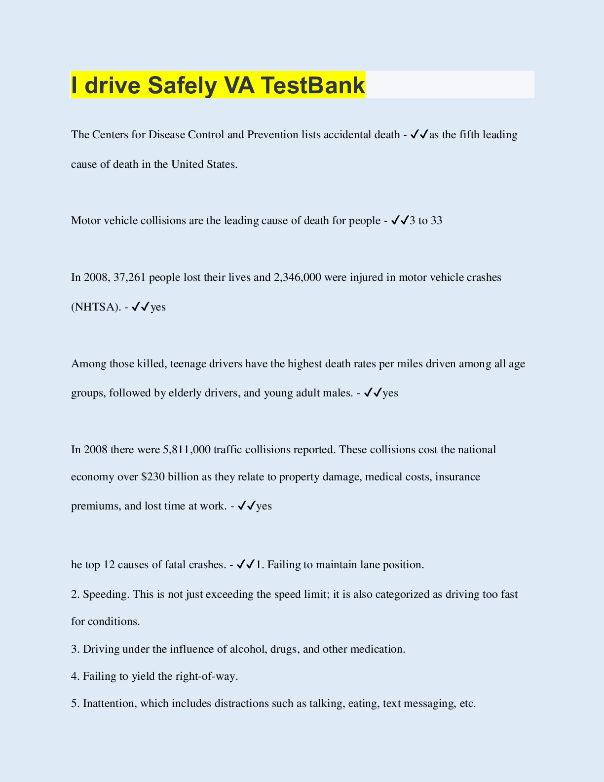 Driving Course > QUESTIONS & ANSWERS > I drive Safely VA TestBank (All)