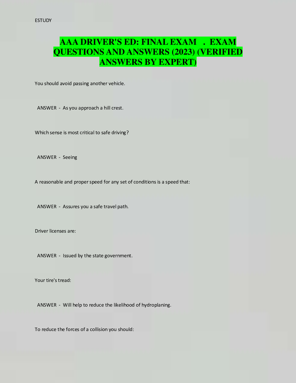 Driving Course > QUESTIONS & ANSWERS > AAA DRIVER'S ED: FINAL EXAM . EXAM QUESTIONS AND ANSWERS (2023) (VERIFIED ANSWERS BY EXPERT) (All)