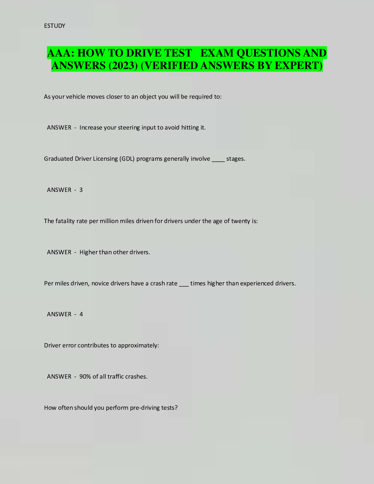 Driving Course > QUESTIONS & ANSWERS > AAA: HOW TO DRIVE TEST EXAM QUESTIONS AND ANSWERS (2023) (VERIFIED ANSWERS BY EXPERT) (All)