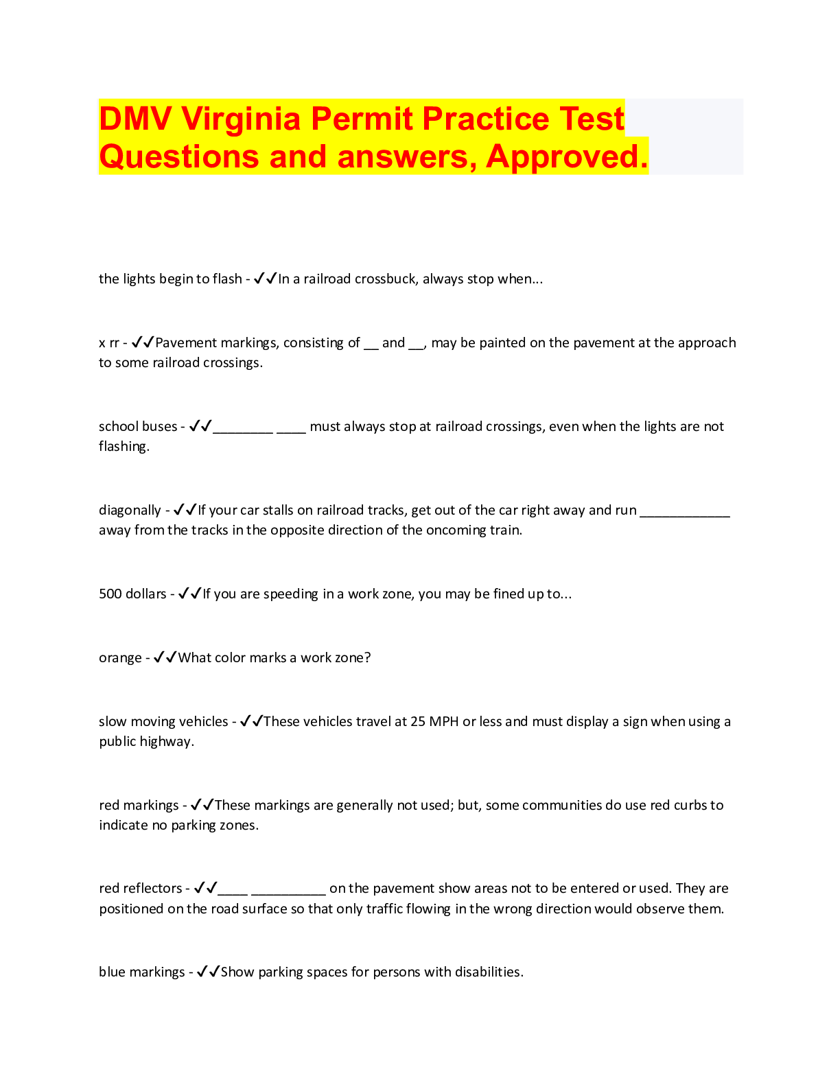 Driving Course > QUESTIONS & ANSWERS > DMV Virginia Permit Practice Test Questions and answers, Approved. (All)