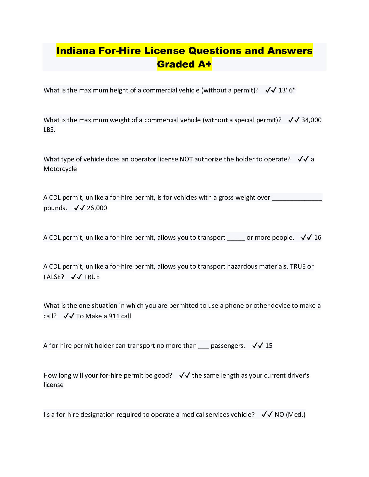 Driving Course > QUESTIONS & ANSWERS > Indiana For-Hire License Questions and Answers Graded A+ (All)