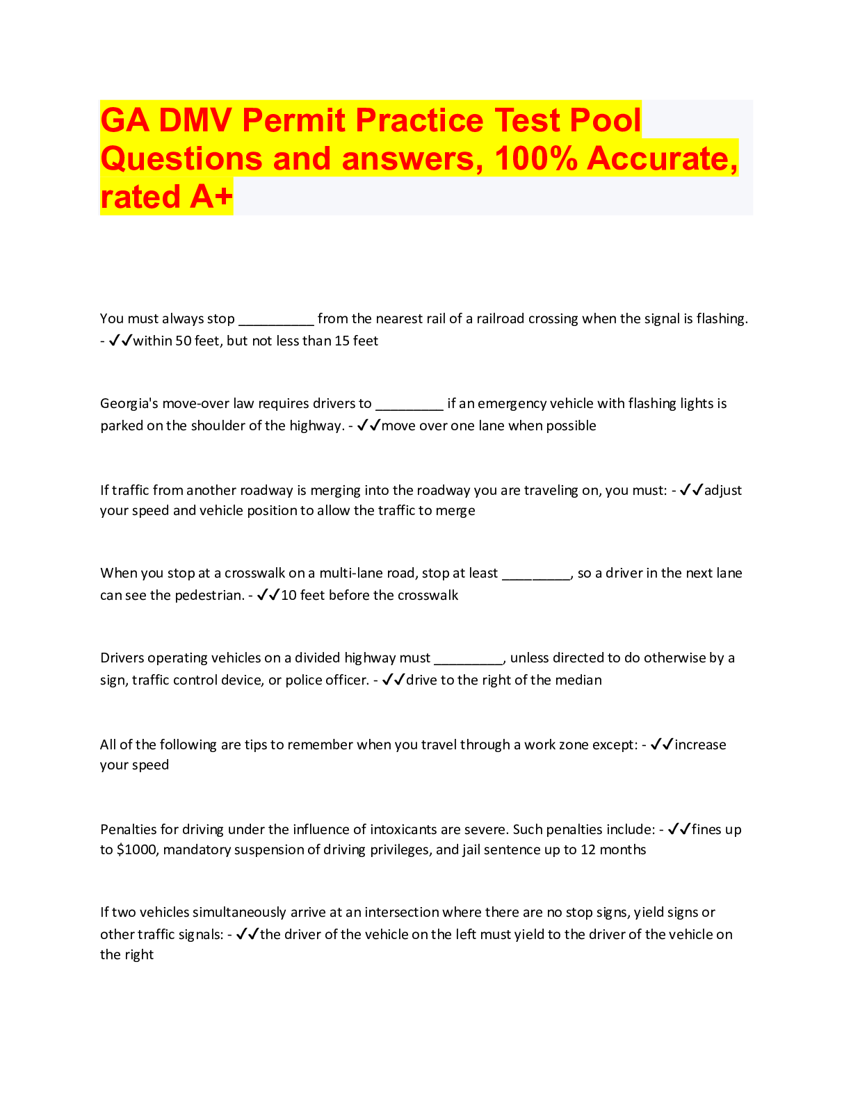 Driving Course > QUESTIONS & ANSWERS > GA DMV Permit Practice Test Pool Questions and answers, 100% Accurate, rated A+ (All)