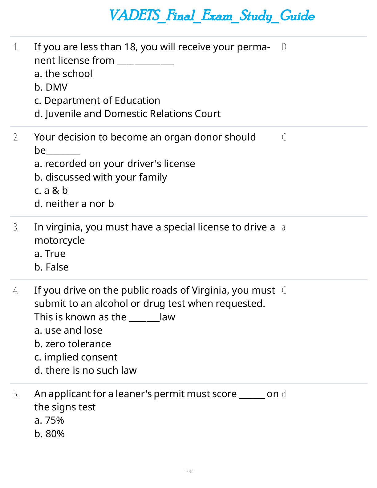 Driving Course > STUDY GUIDE > VADETS Final Exam Study Guide (All)