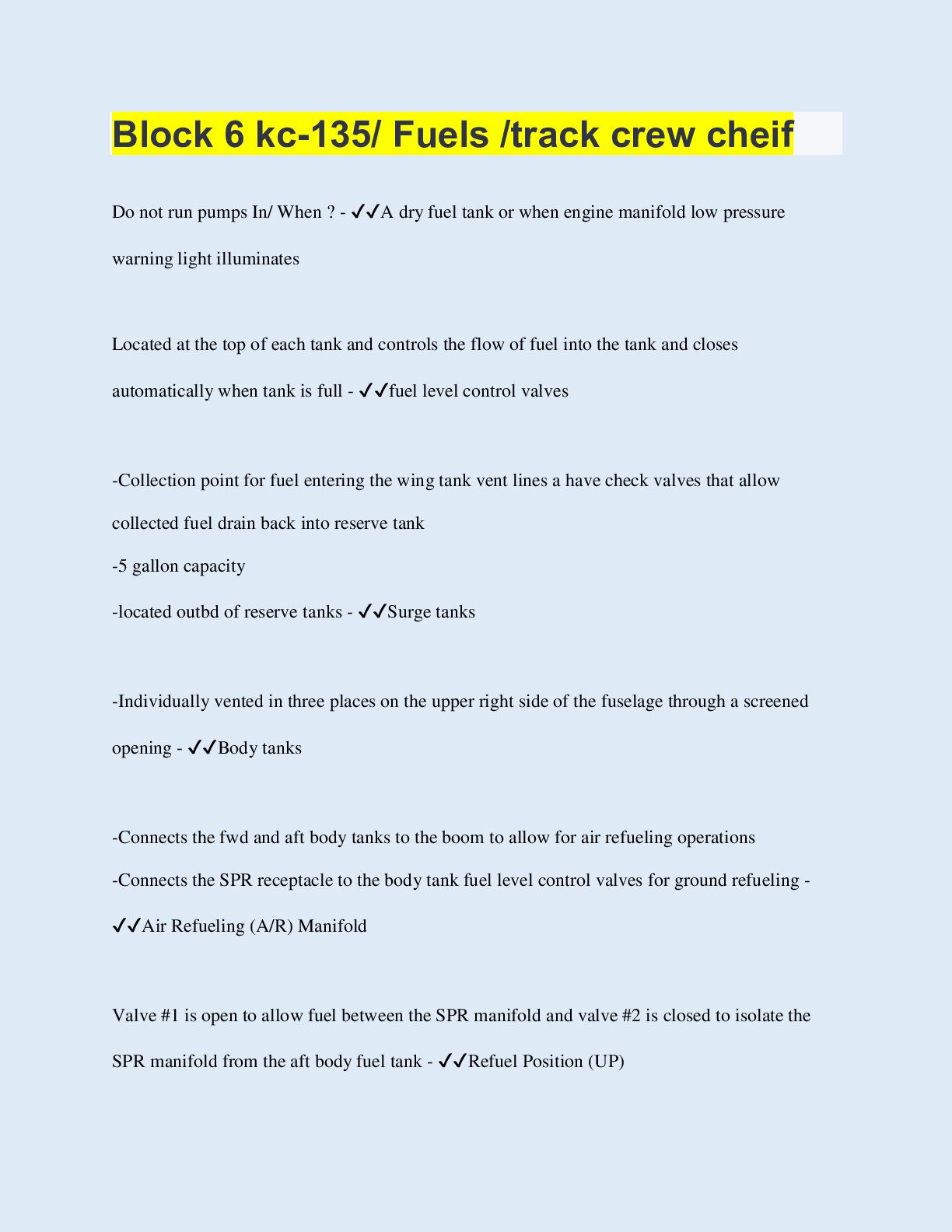 Driving Course > QUESTIONS & ANSWERS > Block 6 kc-135/ Fuels /track crew cheif (All)
