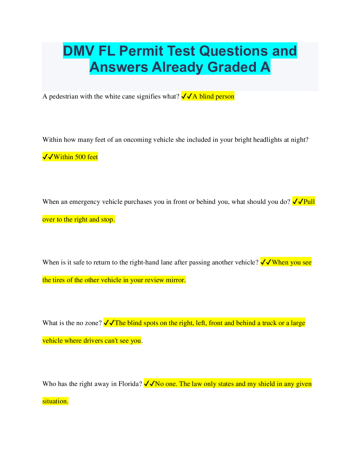 Driving Course > QUESTIONS & ANSWERS > DMV FL Permit Test Questions and Answers Already Graded A (All)