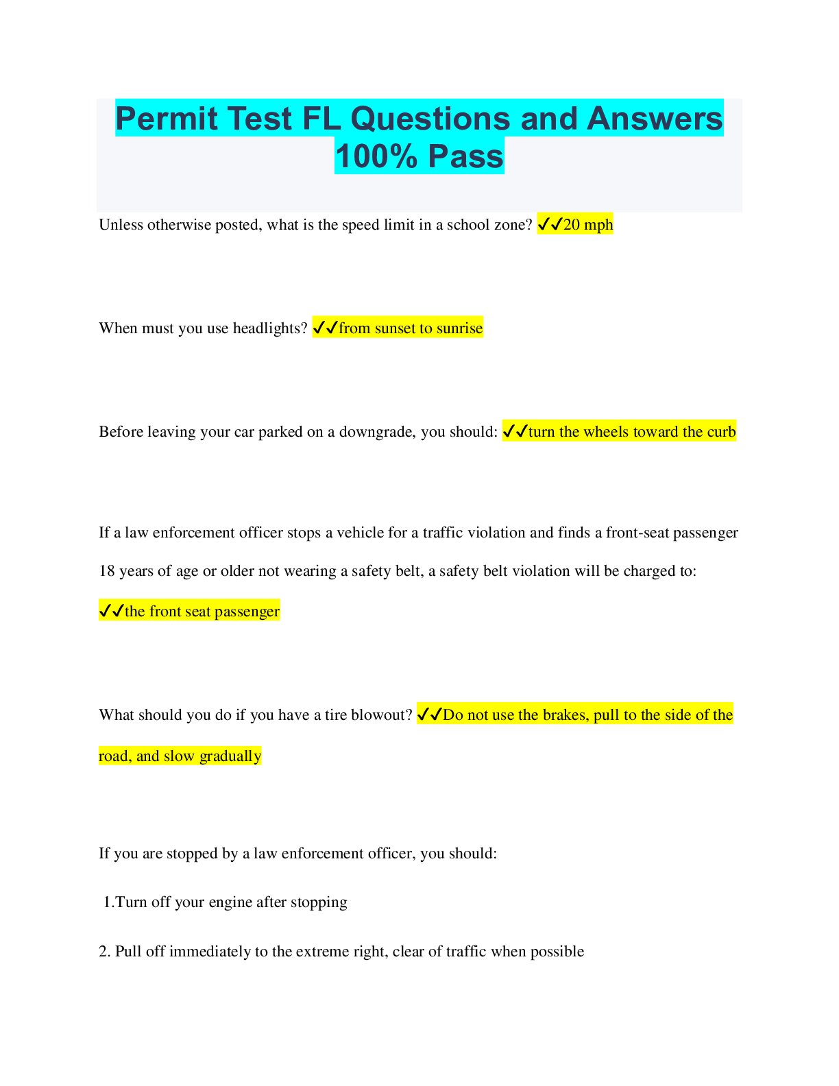 Driving Course > QUESTIONS & ANSWERS > Florida Permit Practice Test with Certified Solutions (All)
