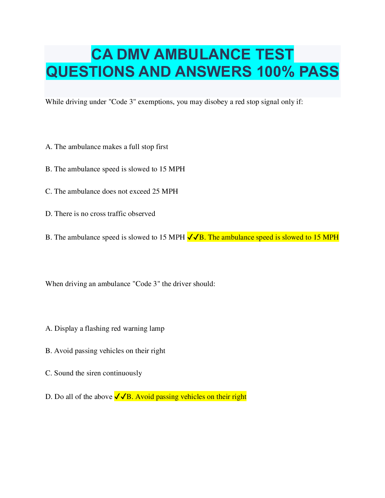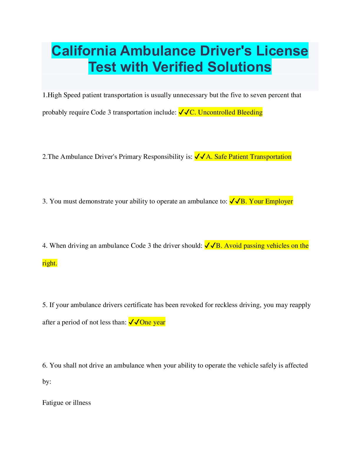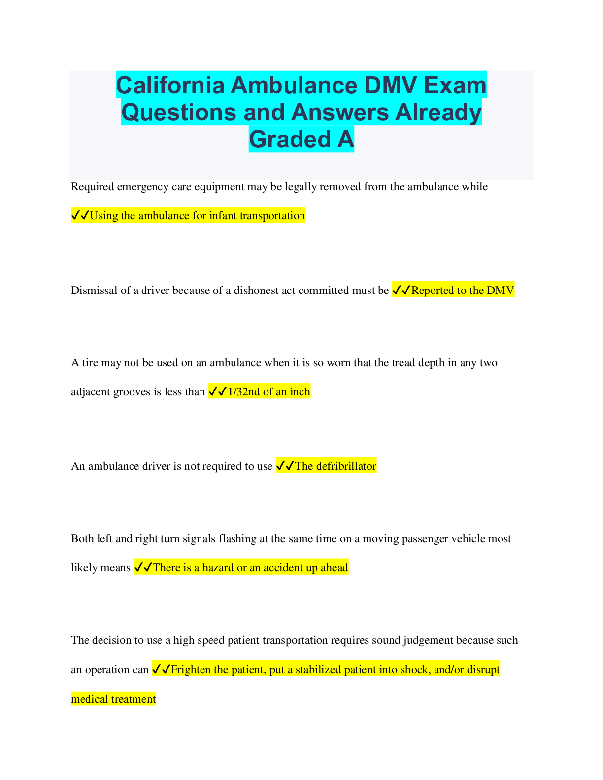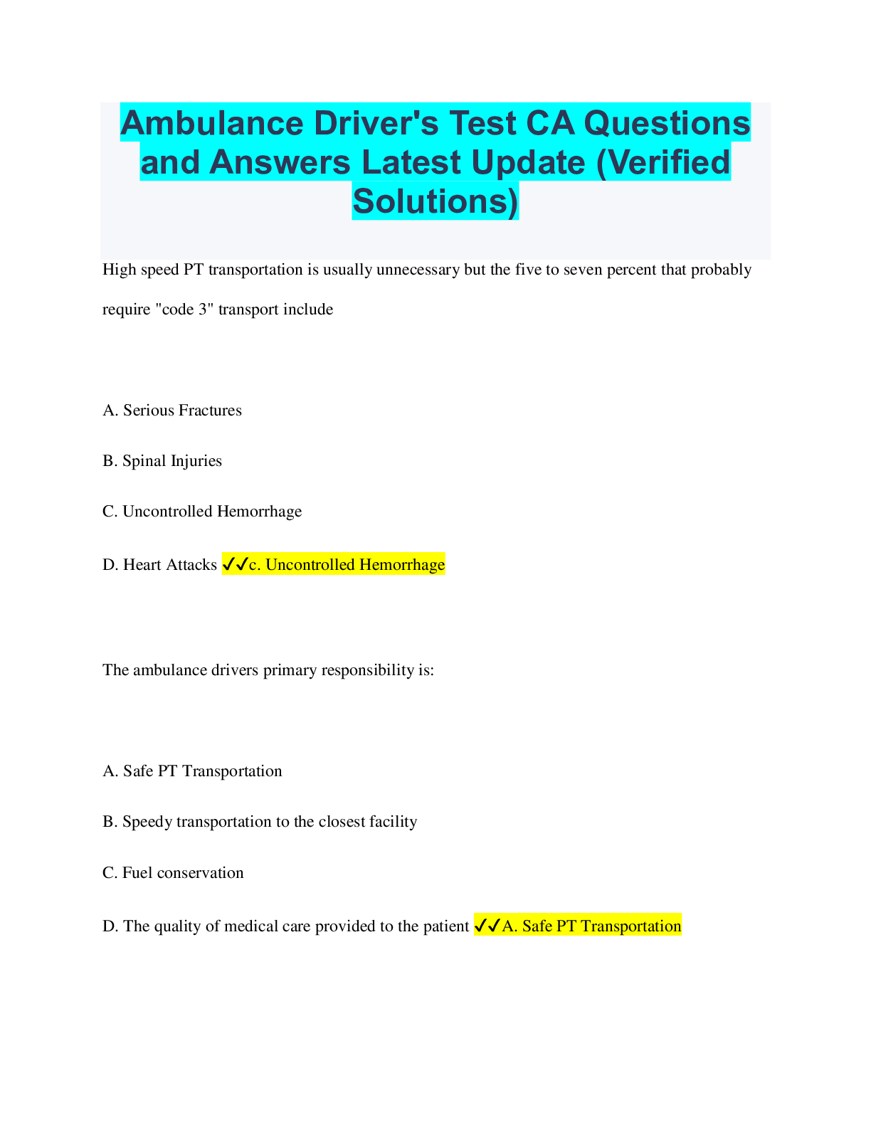 Driving Course > QUESTIONS & ANSWERS > Ambulance Driver's Test CA Questions and Answers Latest Update (Verified Solutions) (All)