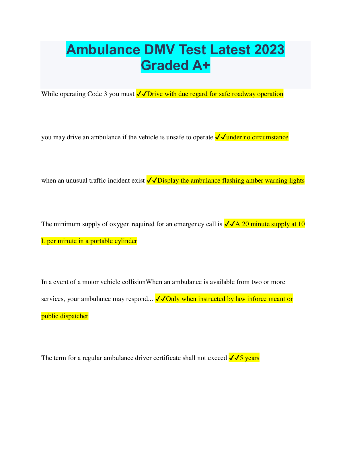Driving Course > QUESTIONS & ANSWERS > Ambulance DMV Test Latest 2023 Graded A+ (All)