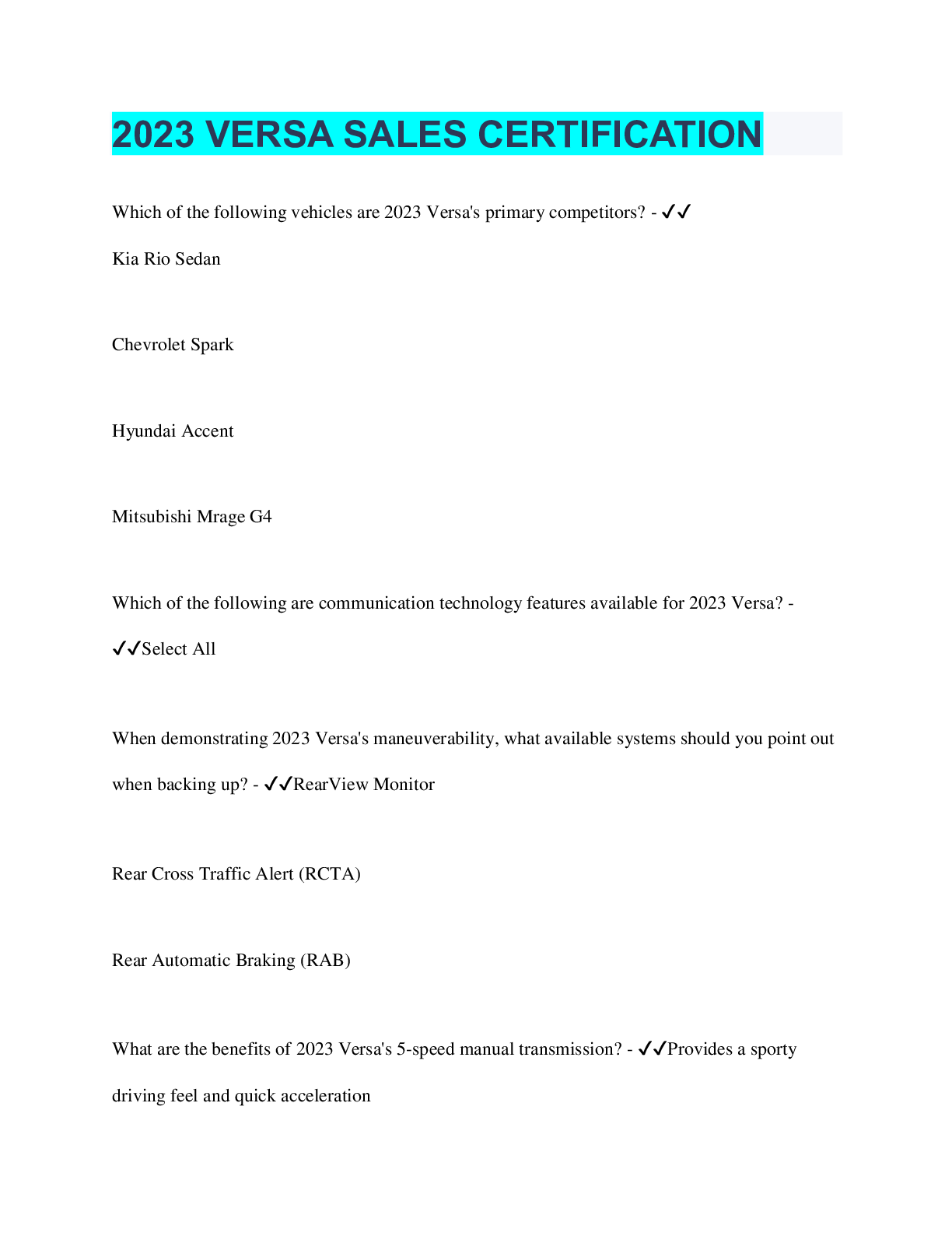 Driving Course > QUESTIONS & ANSWERS > 2023 VERSA SALES CERTIFICATION (All)