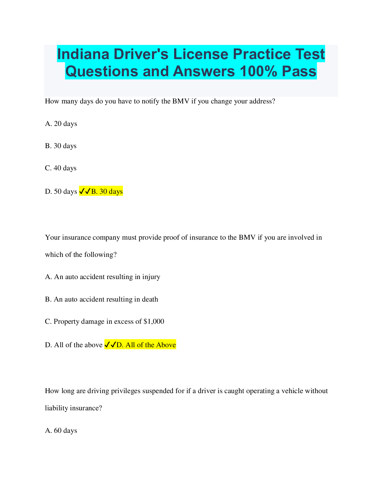 Driving Course > QUESTIONS & ANSWERS > Indiana Driver's License Practice Test Questions and Answers 100% Pass (All)